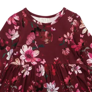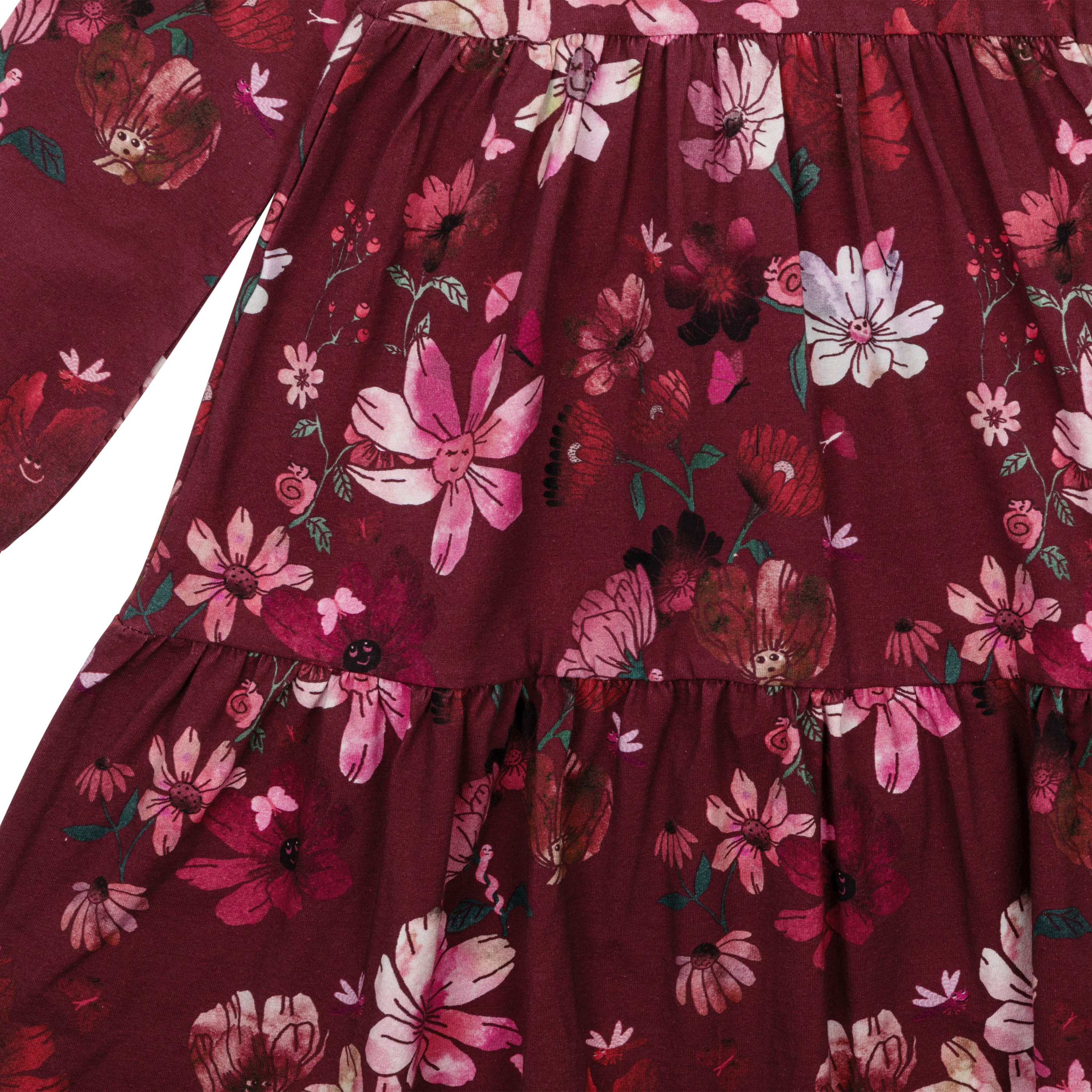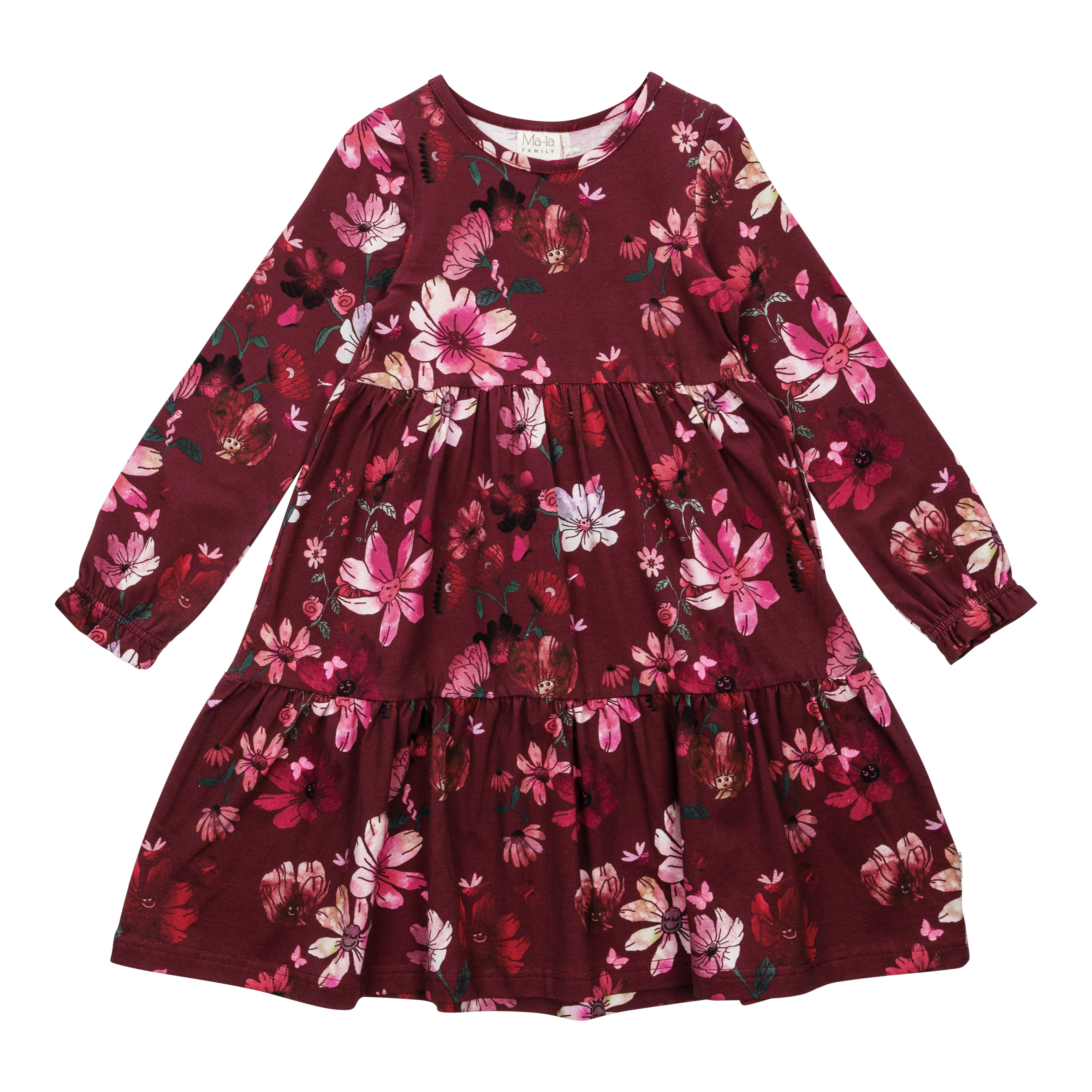 Kukikas lasten pitkähihainen mekko on pehmeää puuvillaa. Siinä on A-linjainen malli, leikkaus rinnan kohdalla ja runsas kahdesta frillasta muodostuva helma. Ihastuttavasti asettuvat runsaat puhvihihat rypytettyine hihansuineen.