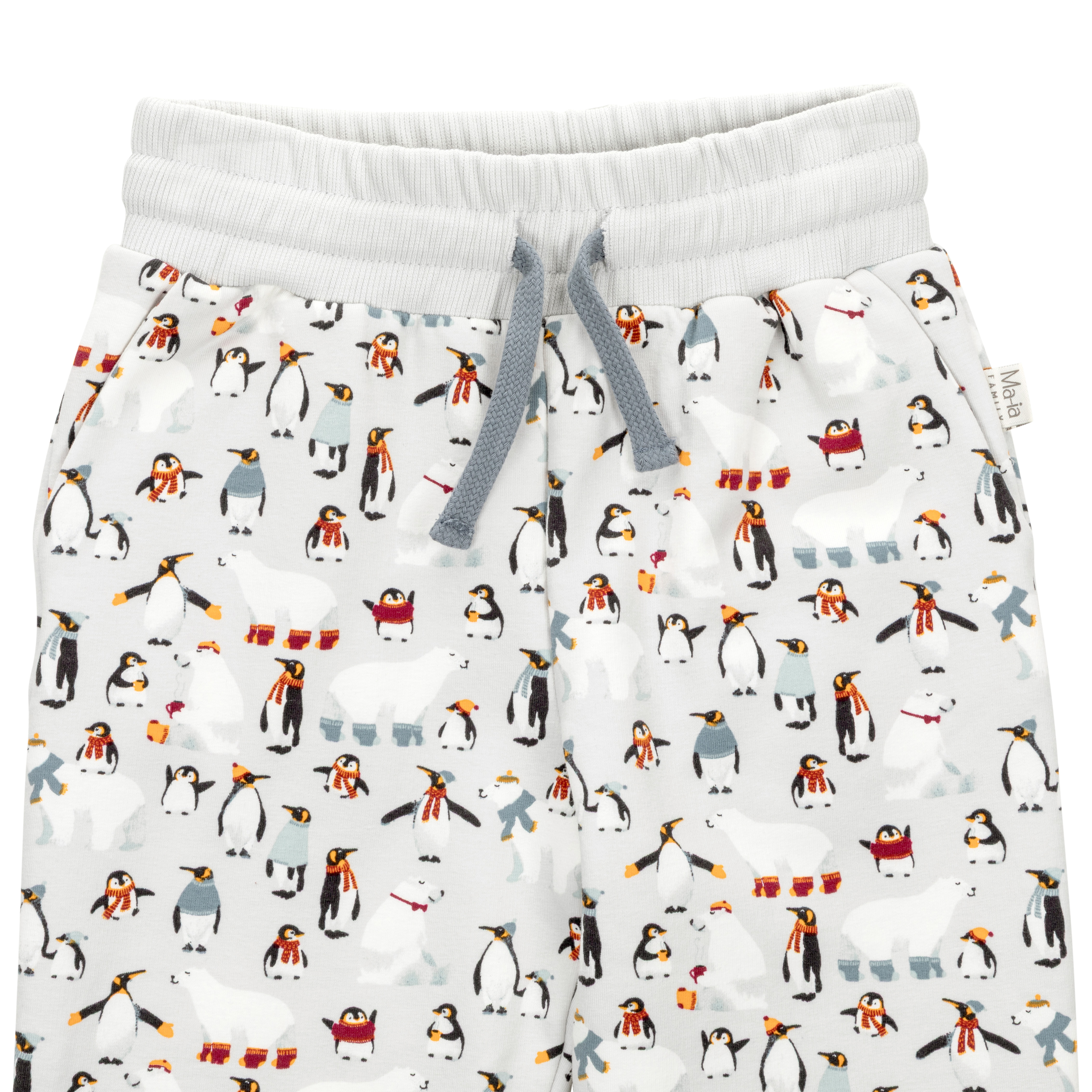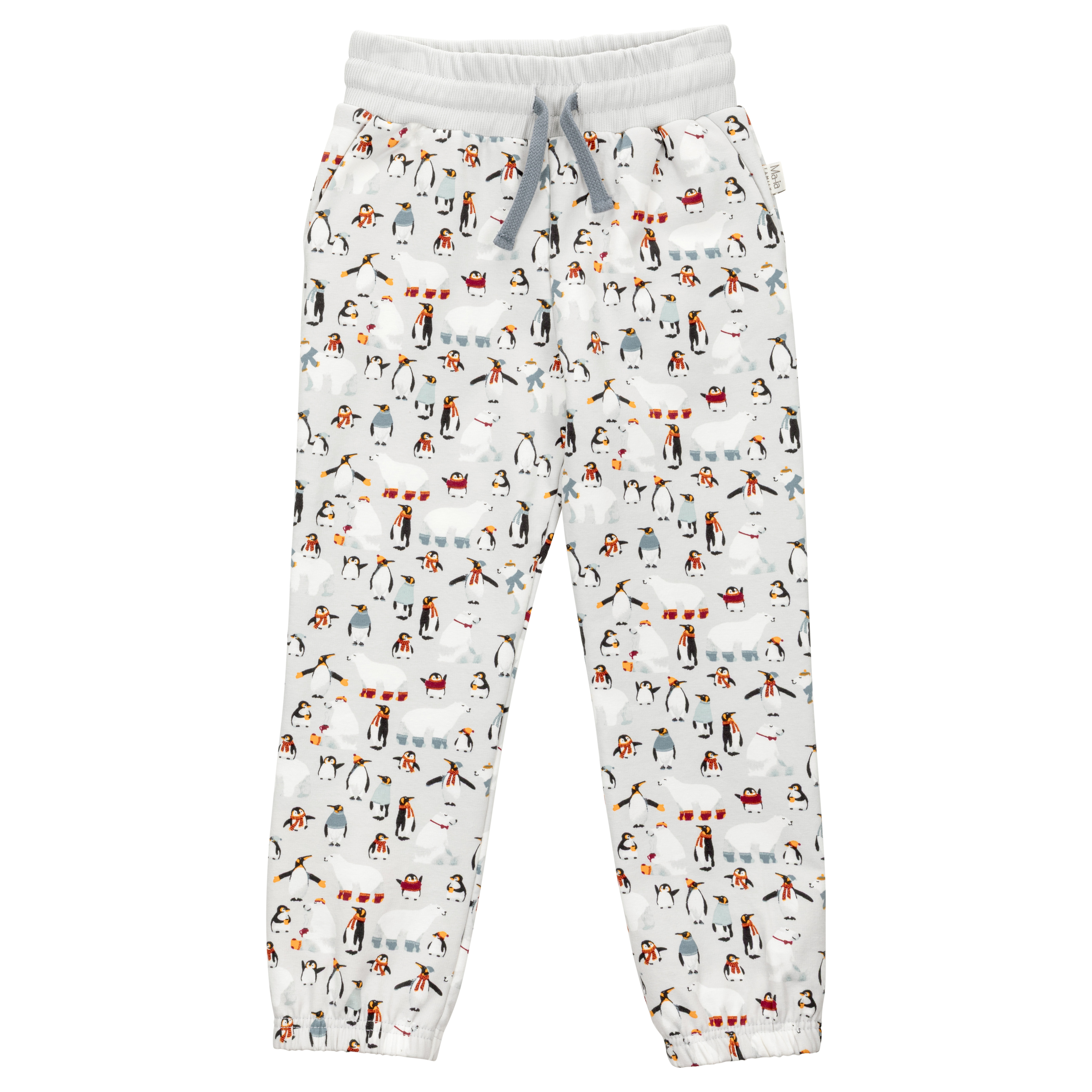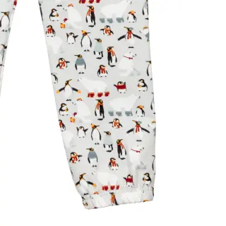 Talviystävät ovat lähteneet ulkoilemaan, talvipäivästä nauttimaan! Jääkarhu on sujauttanut jalkaansa villasukat ja tepastelee iloisena pingviinien joukossa.