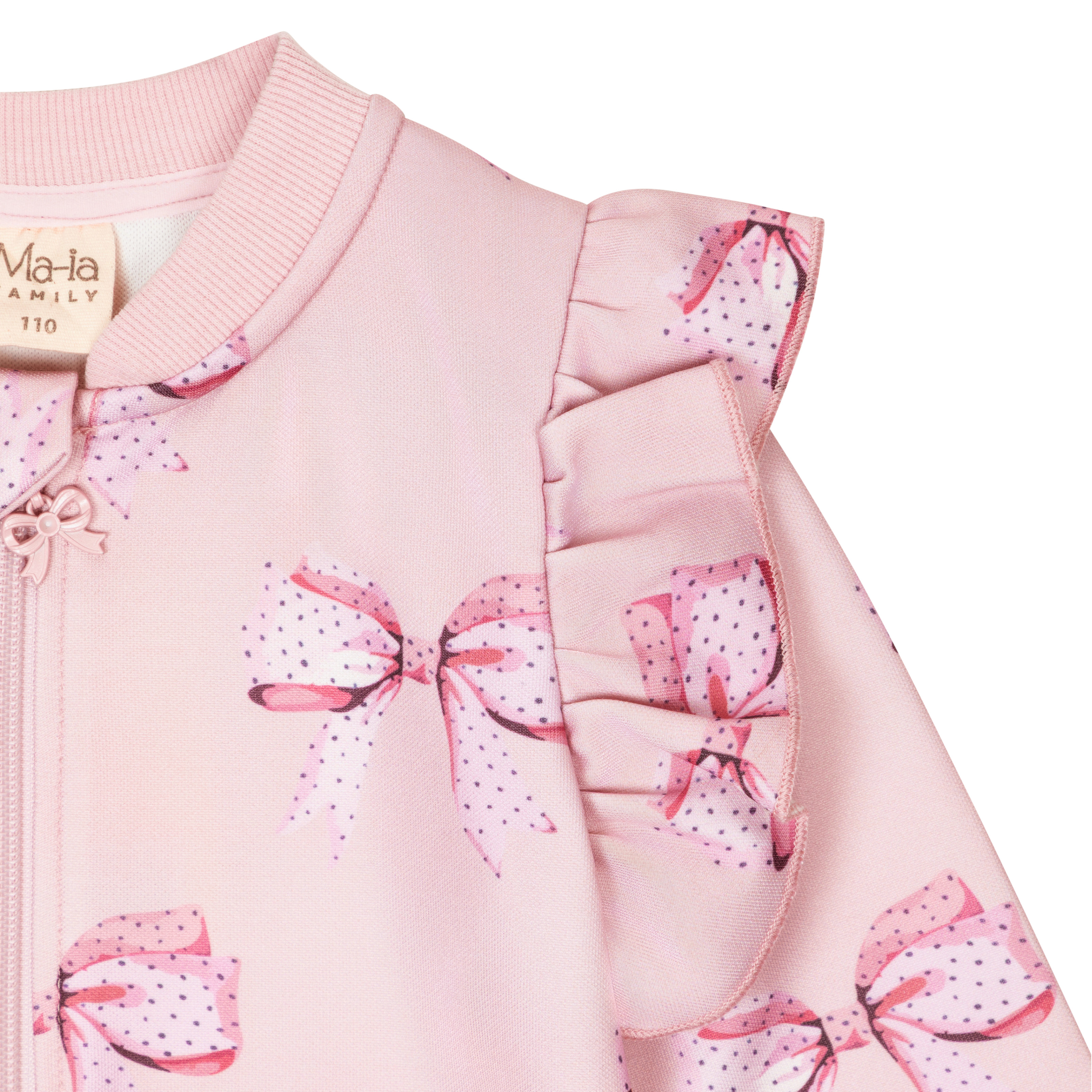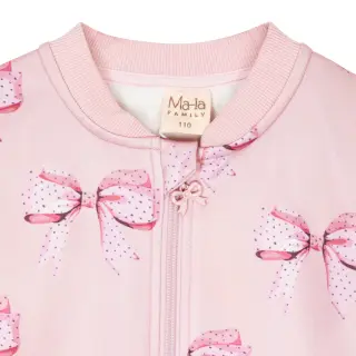 Ihastuttava lasten himmeäkiiltoinen verkkatakki Rosette-kuosilla. Takin valmistukseen on käytetty kierrätettyä polyesteriä ja sen sisäosa on ihoa vasten pehmeäntuntuista puuvillaa. Verryttelytakissa on pitkät hihat, taskut, resorit hihansuissa, helmassa ja pääntiellä, vetoketjusuoja leuan alla ja olkapäillä hurmaavat frillayksityiskohdat. Pitkää vetoketjua koristaa suloinen rusettiyksityiskohta. Suunniteltu Suomessa.