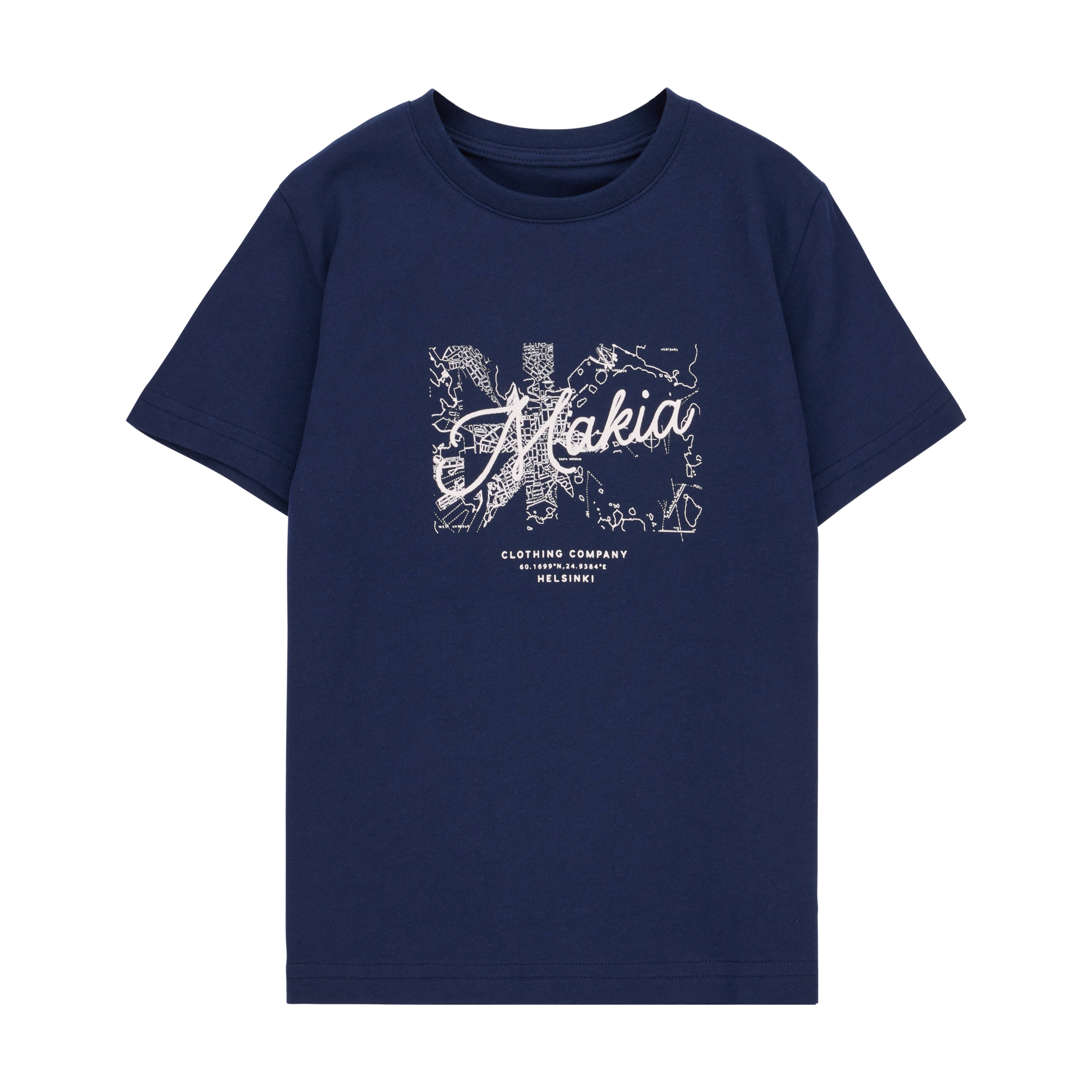Mukava ja tyylikäs Makia T-paita lapsille. Tämä tummansininen T-paita sopii täydellisesti arkipukeutumiseen ja rentoon vapaa-aikaan, ja se tarjoaa erinomaisen käyttömukavuuden koko päivän ajan. Ajaton design ja laadukas materiaali tekevät T-paidasta monikäyttöisen valinnan. T-paidassa on valkoinen printti Helsingin kaupungin kartasta, jota täydentää painettuna tarkennettu koordinaatti.