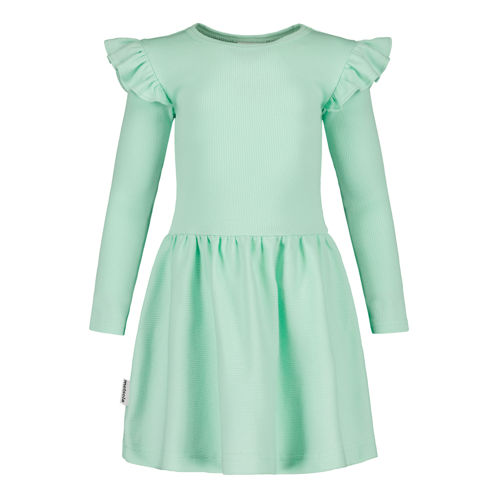 Metsola Rib Frilla -mekko mintie-sävyssä on ihastuttava lasten pitkähihainen mekko, jossa yhdistyvät leikkisä ilme ja arjen käytännöllisyys. Raikas mintunvärinen Mintie-sävy tuo asuun raikasta väriä ja iloa.