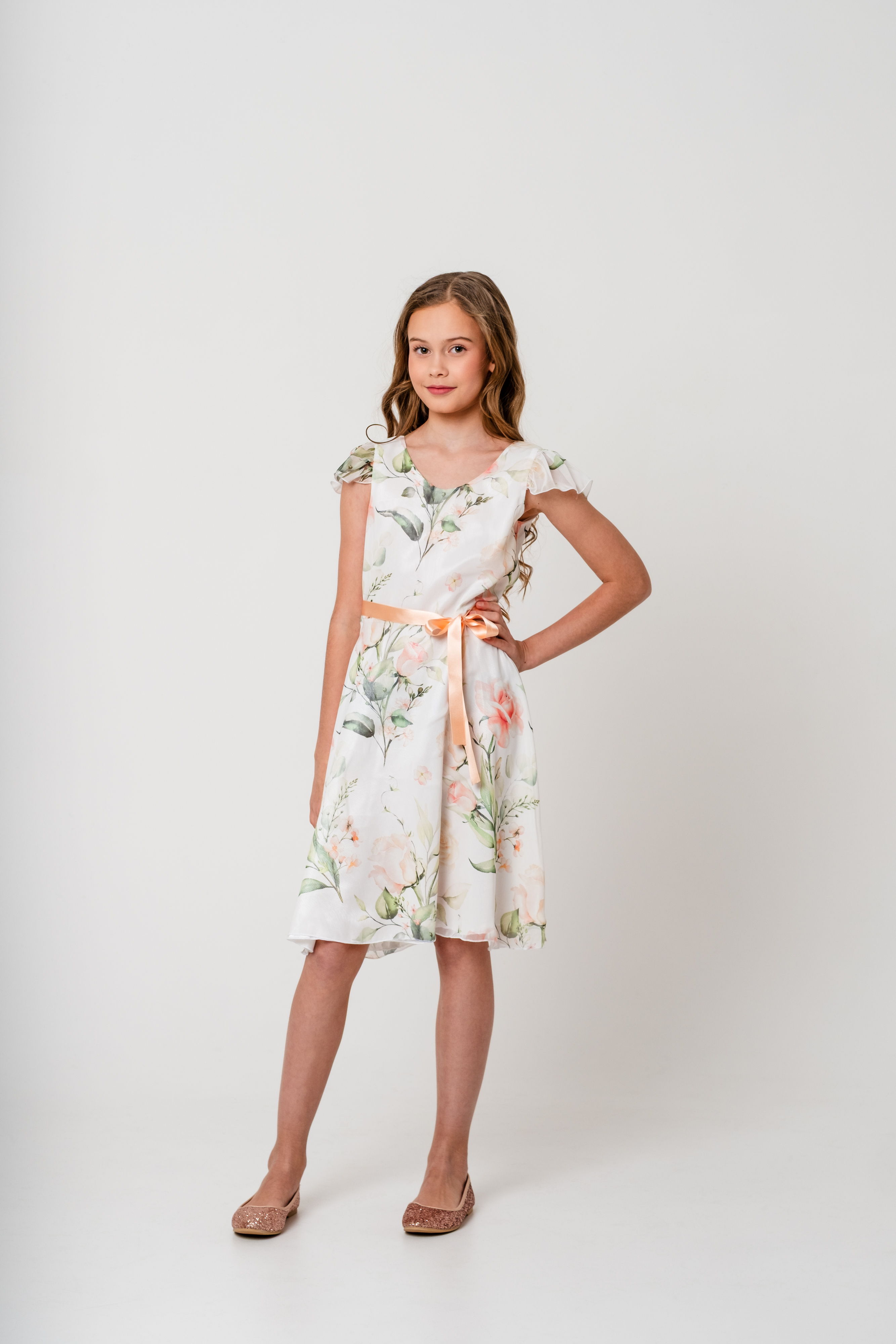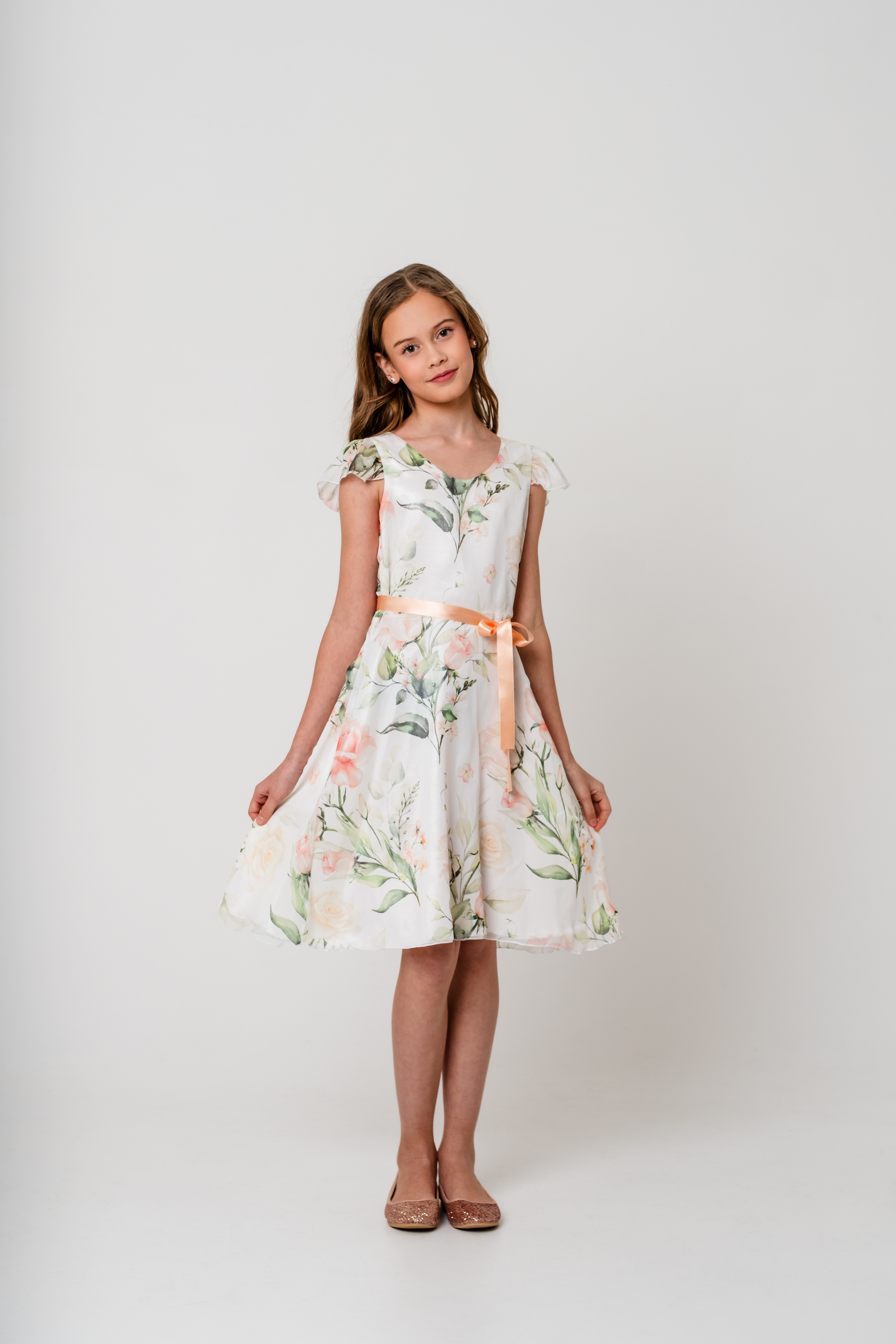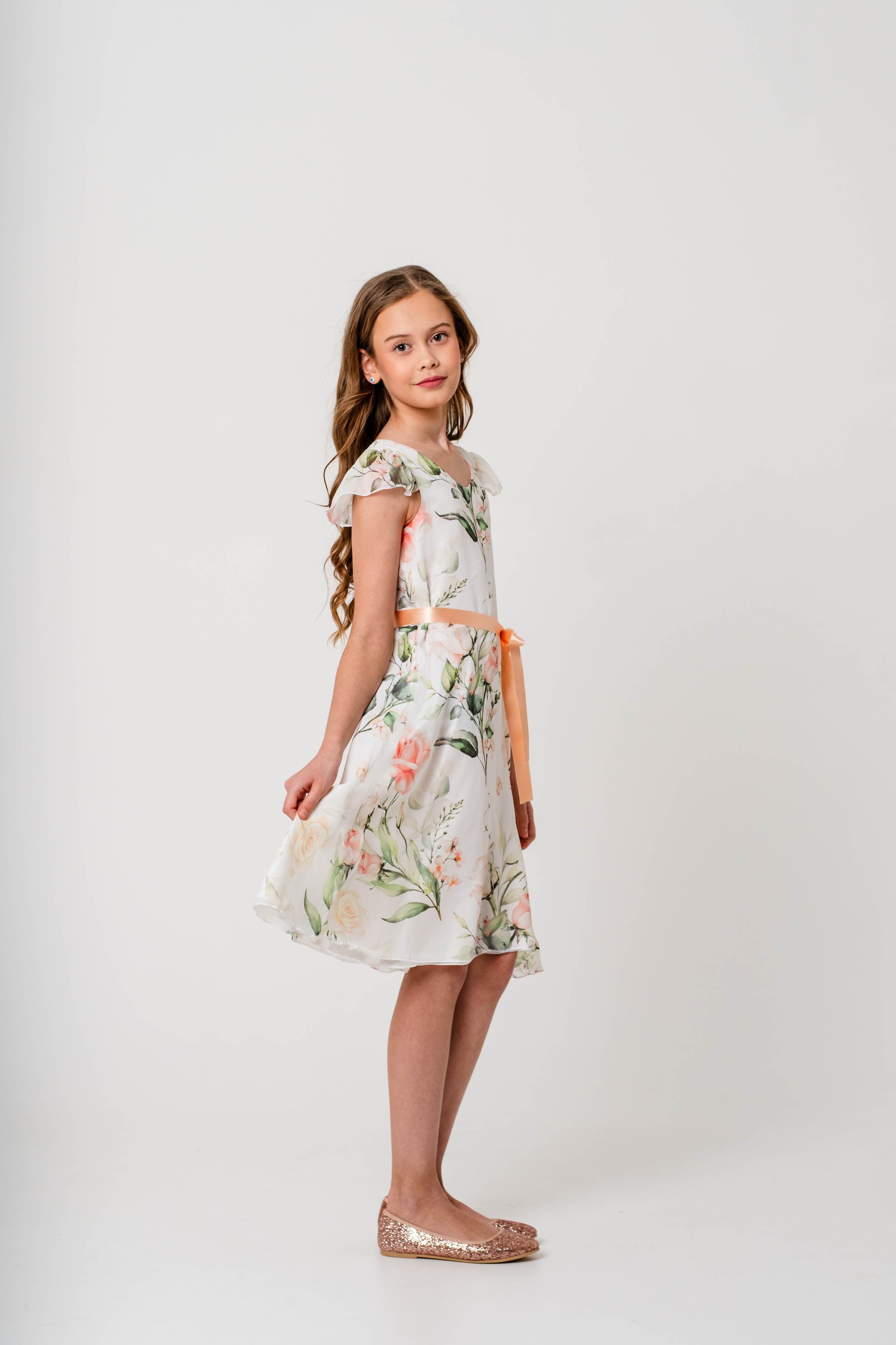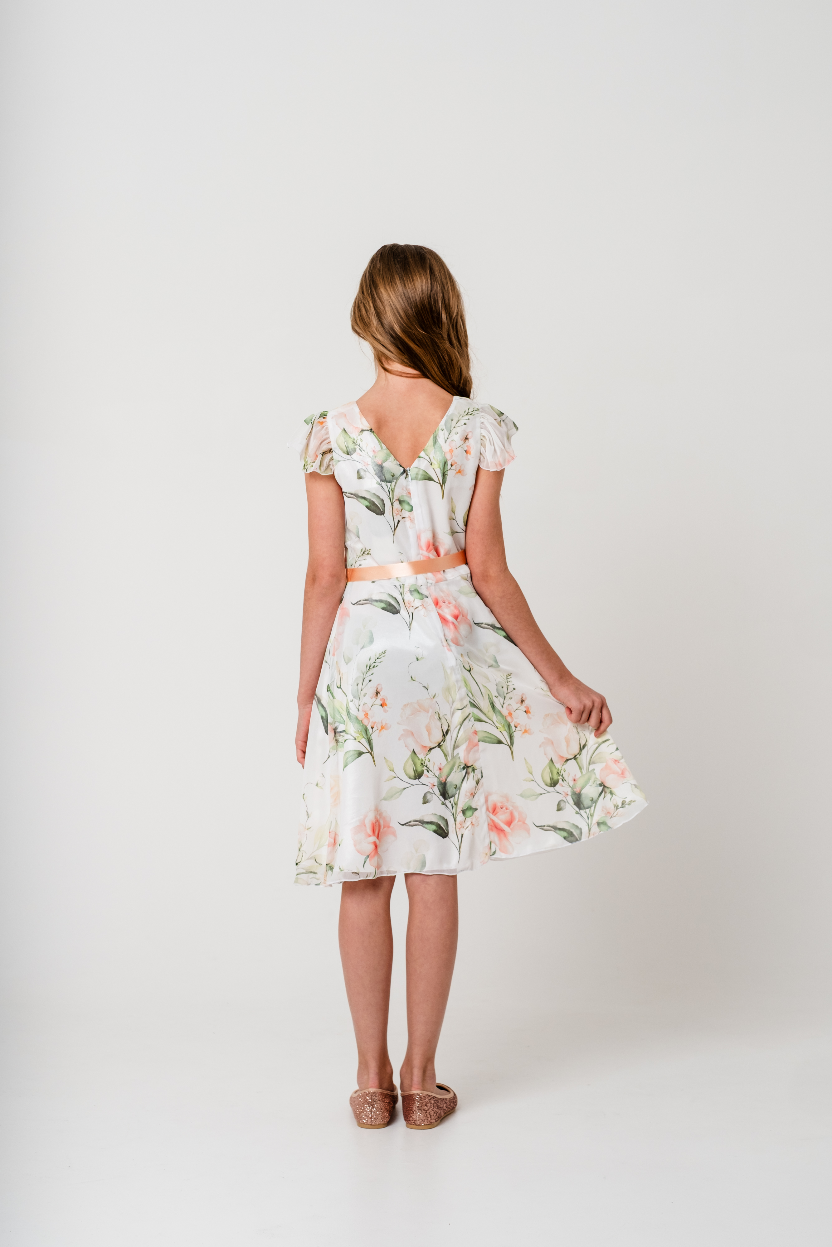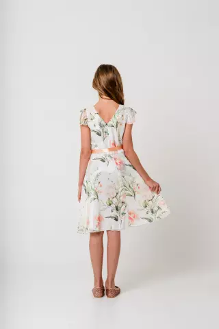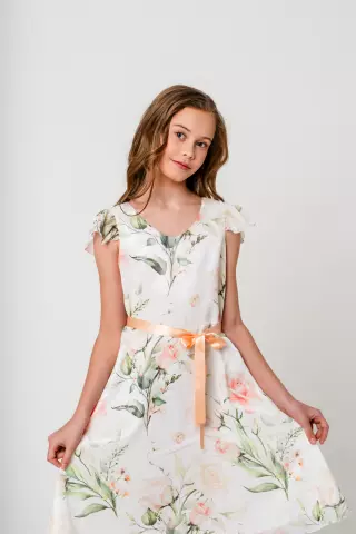 Mingnelin mekko, jossa on kevyt, upealla kukkakuosilla koristettu sifonkinen päälliskangas ja alla kauniisti hohtava satiininen aluskangas. Mekossa on lyhyet sifonkihihat, kauniisti hulmuava, runsas alaosa ja vyötärölle solmittavat satiininauhat. Takana selässä vetoketju kiinnitys.