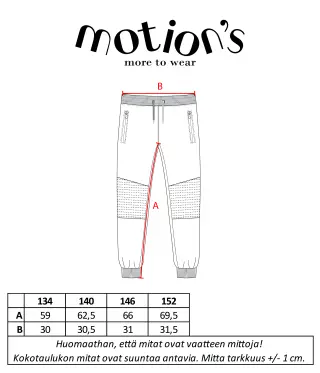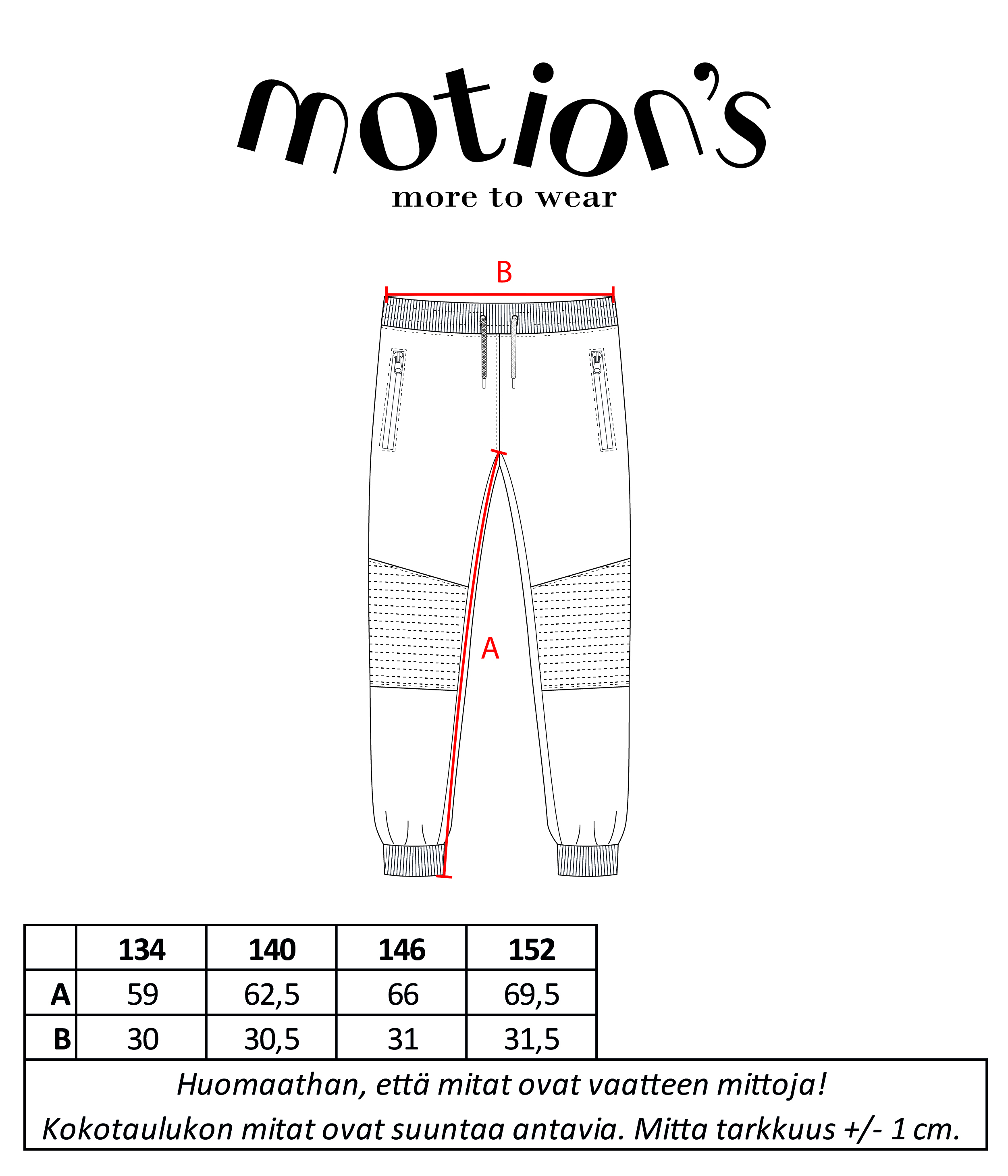 Motion's collegehousut ovat täydellinen valinta arjen pukeutumiseen! Collegehousut ovat nurjalta puolelta harjattu pehmeäksi, joka tuntuu pehmeältä ihoa vasten. Housuissa on vetoketjutaskut ja vahvistetut polvet tikkauksilla. Housujen vyötärö on säädettävissä. Mukavan, leikin kestävän asukokonaisuuden saat yhdistämällä collegehousut esimerkiksi Motion's collegepaitaan.