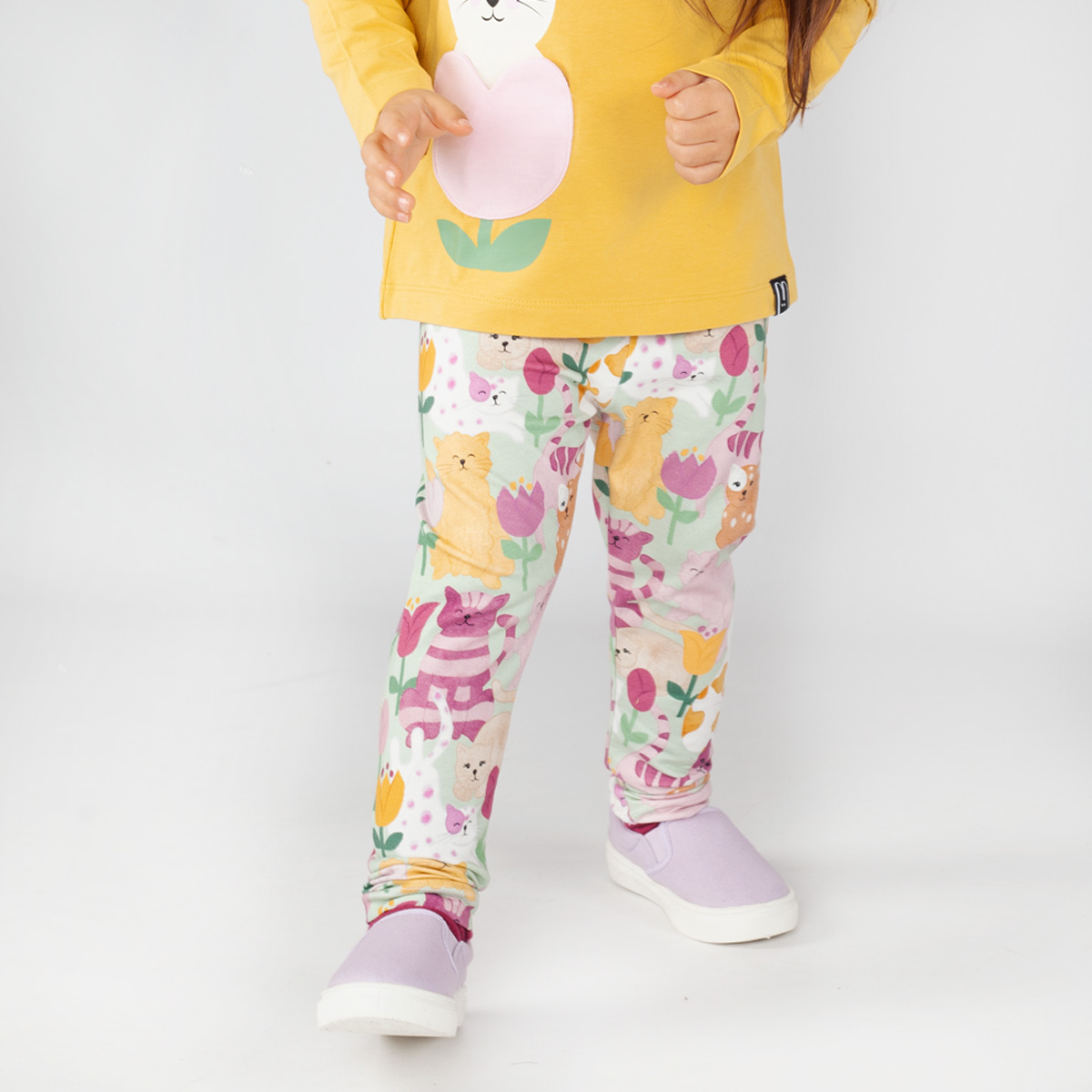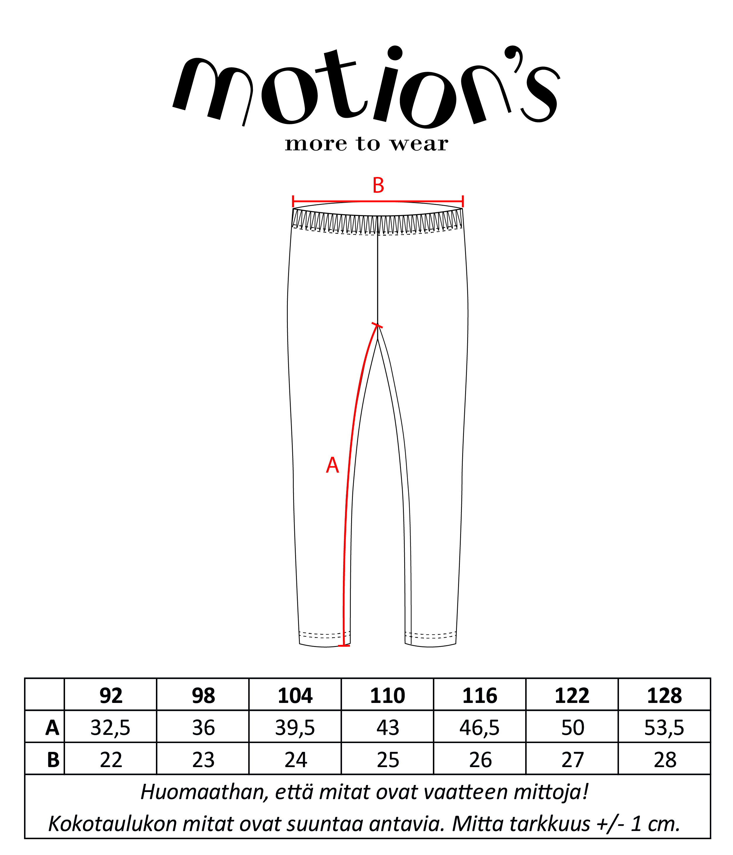Motion's leggingisit ovat monikäyttöinen arkivaate! Näitä leggingsejä koristaa kaunis kukka- ja kissakuosi. Leggingsien materiaali on pehmeää ja joustavaa luomupuuvillatrikoota, jonka ansiosta ne ovat erittäin mukavat päällä. Niissä on myös joustava vyötärö, joka ei kiristä.