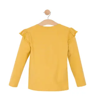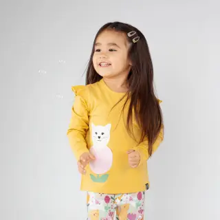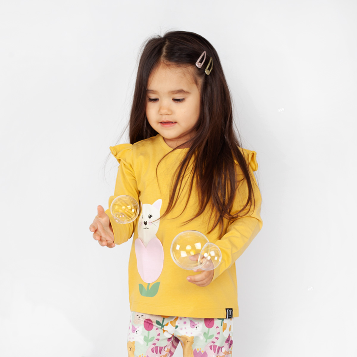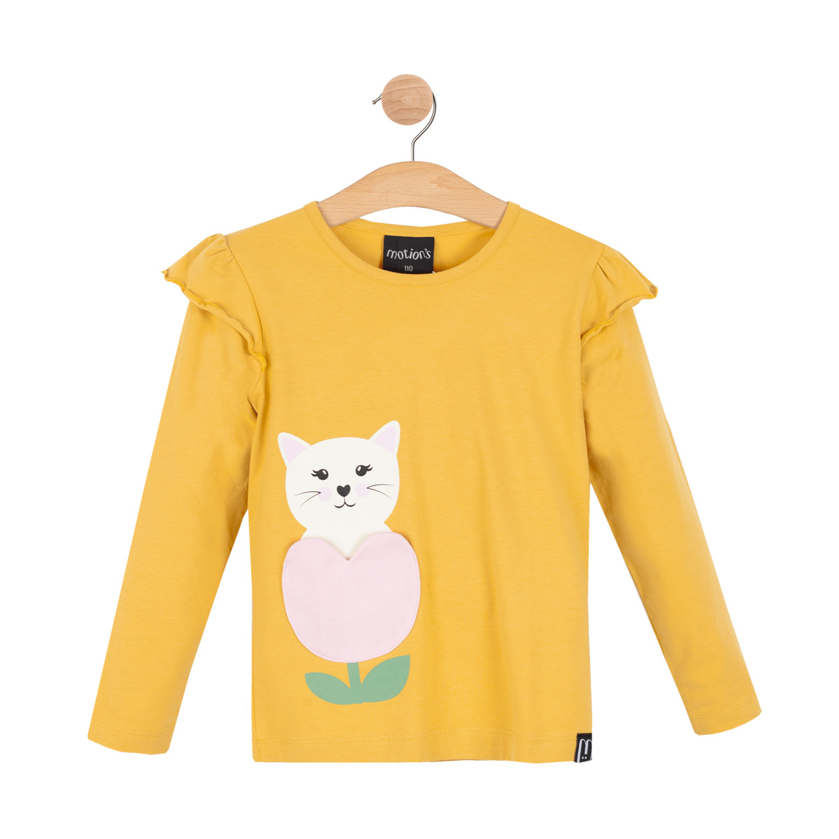 Motion's pitkähihainen paita, jossa on hellyyttävä kissaprintti rinnassa. Paidan pehmeä puuvillatrikoo tuntuu mukavalta päällä, ja kauniit frillat olalla saavat pienet perhoset lentämään.