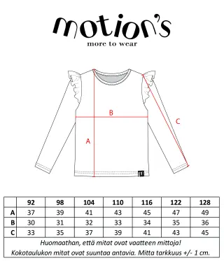 Tämä paita on erinomainen valinta arjen menoihin! Suloisen, leikin kestävän asukokonaisuuden saat yhdistämällä paidan esimerkiksi Motion's collegehousuihin tai leggingseihin.