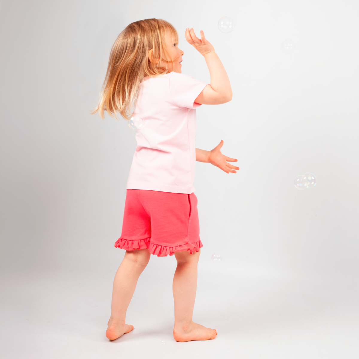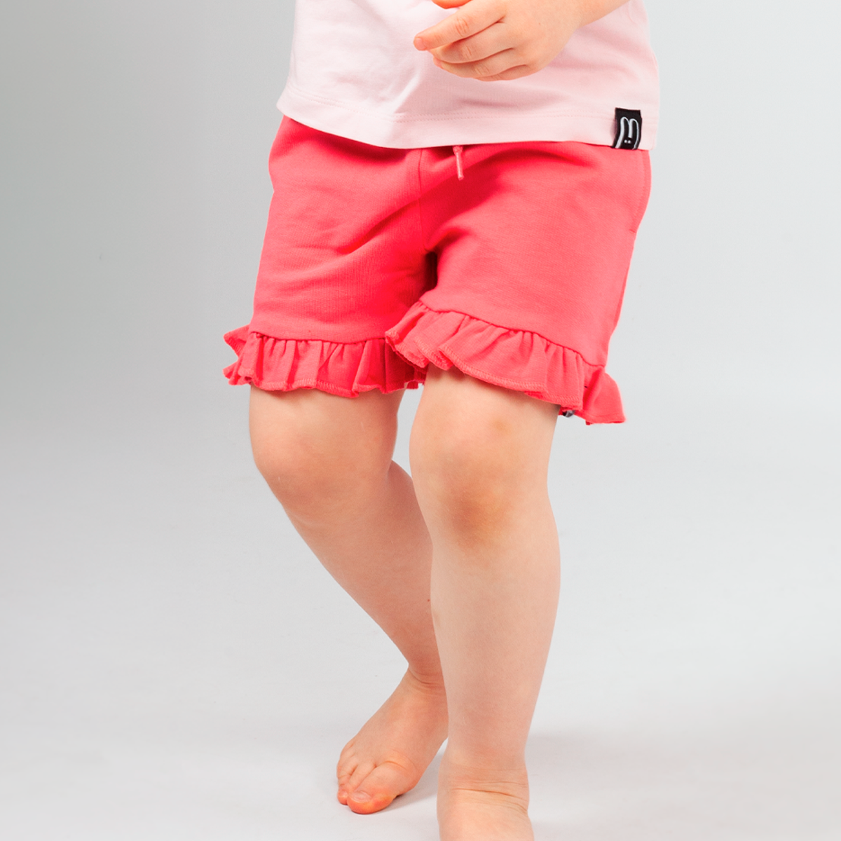 Shortsien harjaamaton froteekangas materiaali on pehmeää ja joustavaa luomupuuvillaa, jonka ansiosta ne ovat erittäin mukavat päällä. Niissä on myös joustava vyötärö, joka ei kiristä sekä taskut. Pirtsakka korallin sävy sopii kesän rientoihin!