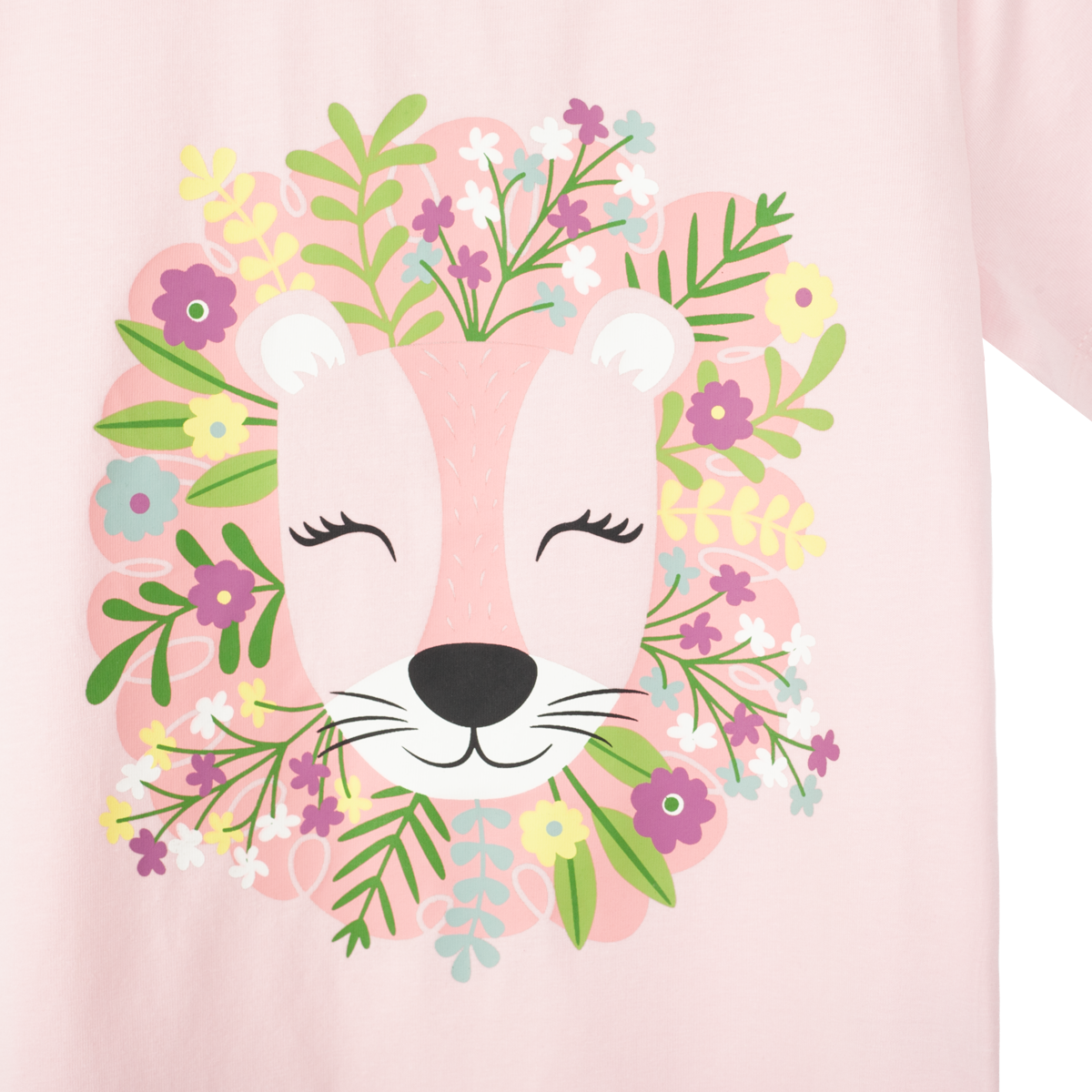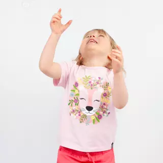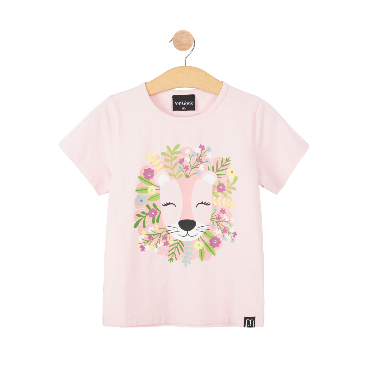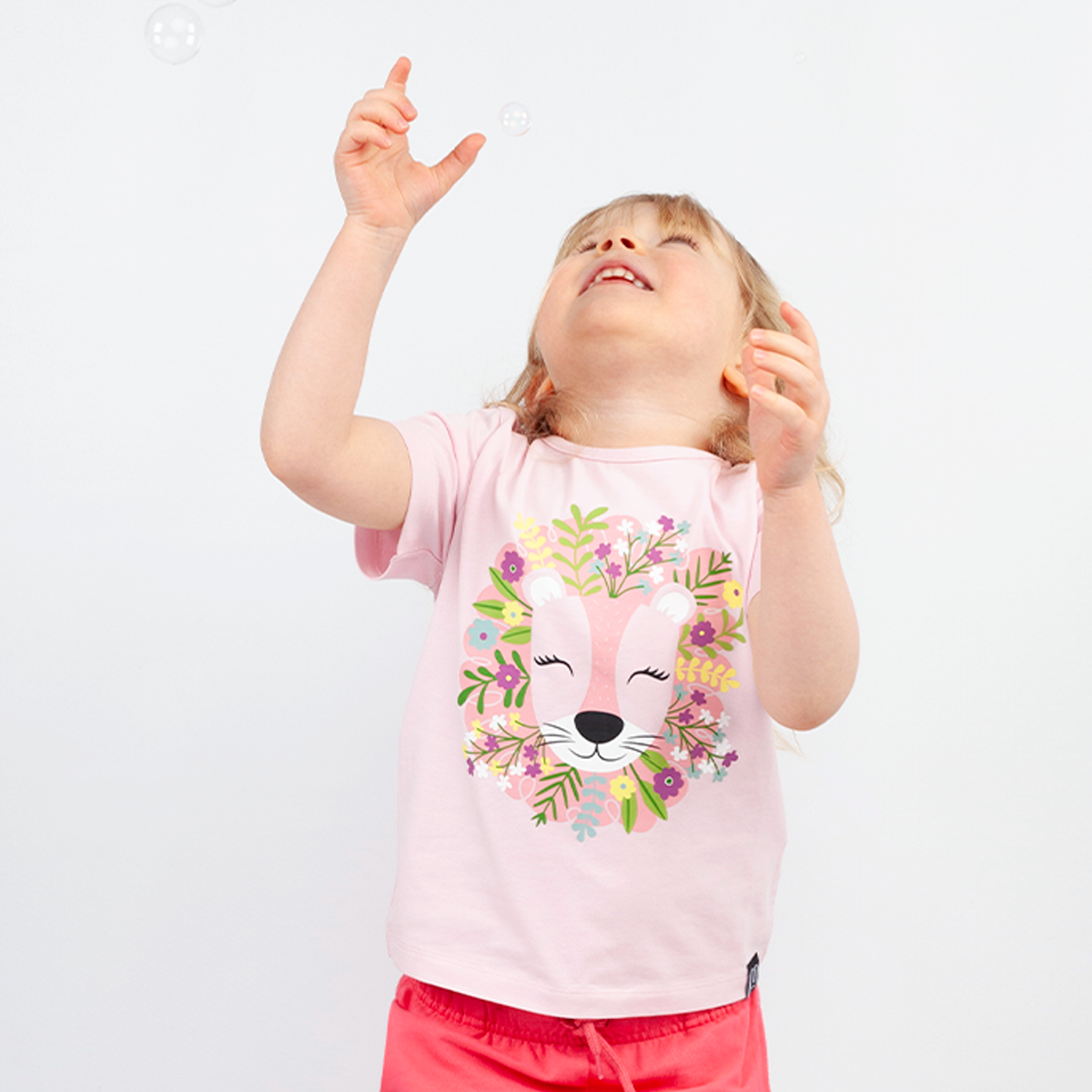 Ihastuttava Motion's T-paita vaaleanpunaisessa värissä. Paidan materiaali on pehmeää ja joustavaa luomupuuvillatrikoota, joka tuntuu miellyttävältä iholla. Tässä paidassa on ihastuttava leijonan printti, jonka harjassa on kukkia. Erinomainen valinta arjen menoihin! Leikin kestävän asukokonaisuuden saat yhdistämällä paidan esimerkiksi Motion's shortsien tai legginssien kanssa.