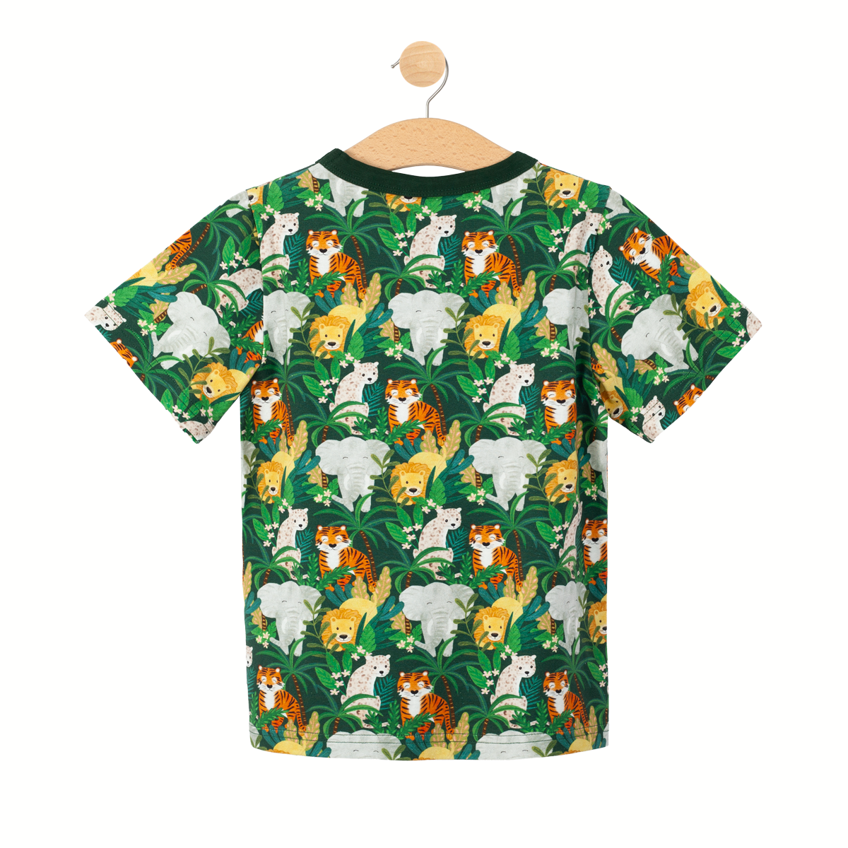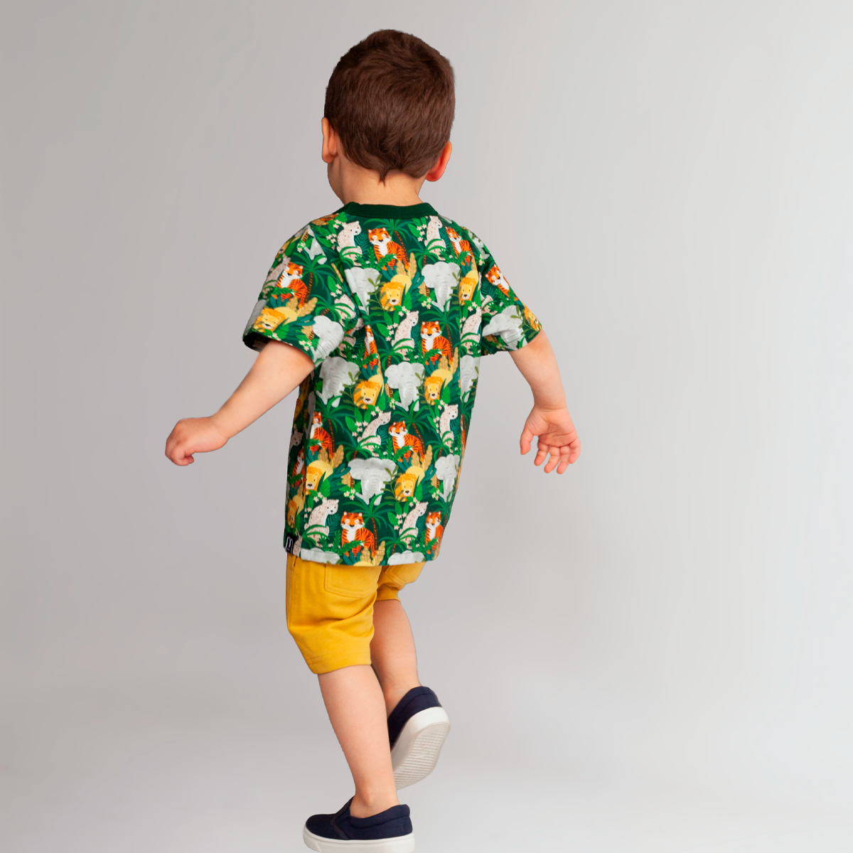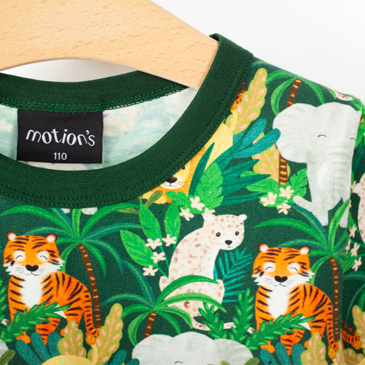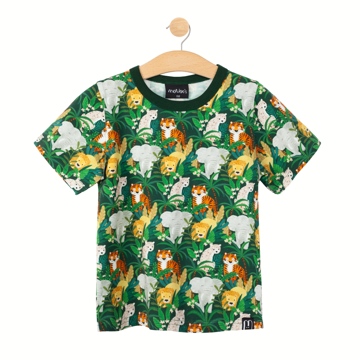 Hauska Motion's T-paita, joka on kuvioitu täysin viidakko teemaisesti. Tämän vihreän sävyisen paidan materiaali on pehmeää ja joustavaa luomupuuvillatrikoota, joka tuntuu miellyttävältä iholla. Paita on rento perusvaate ja siten erinomainen valinta arjen menoihin! Leikin kestävän asukokonaisuuden saat yhdistämällä paidan esimerkiksi Motion's shortsien tai leggingseiden kanssa.