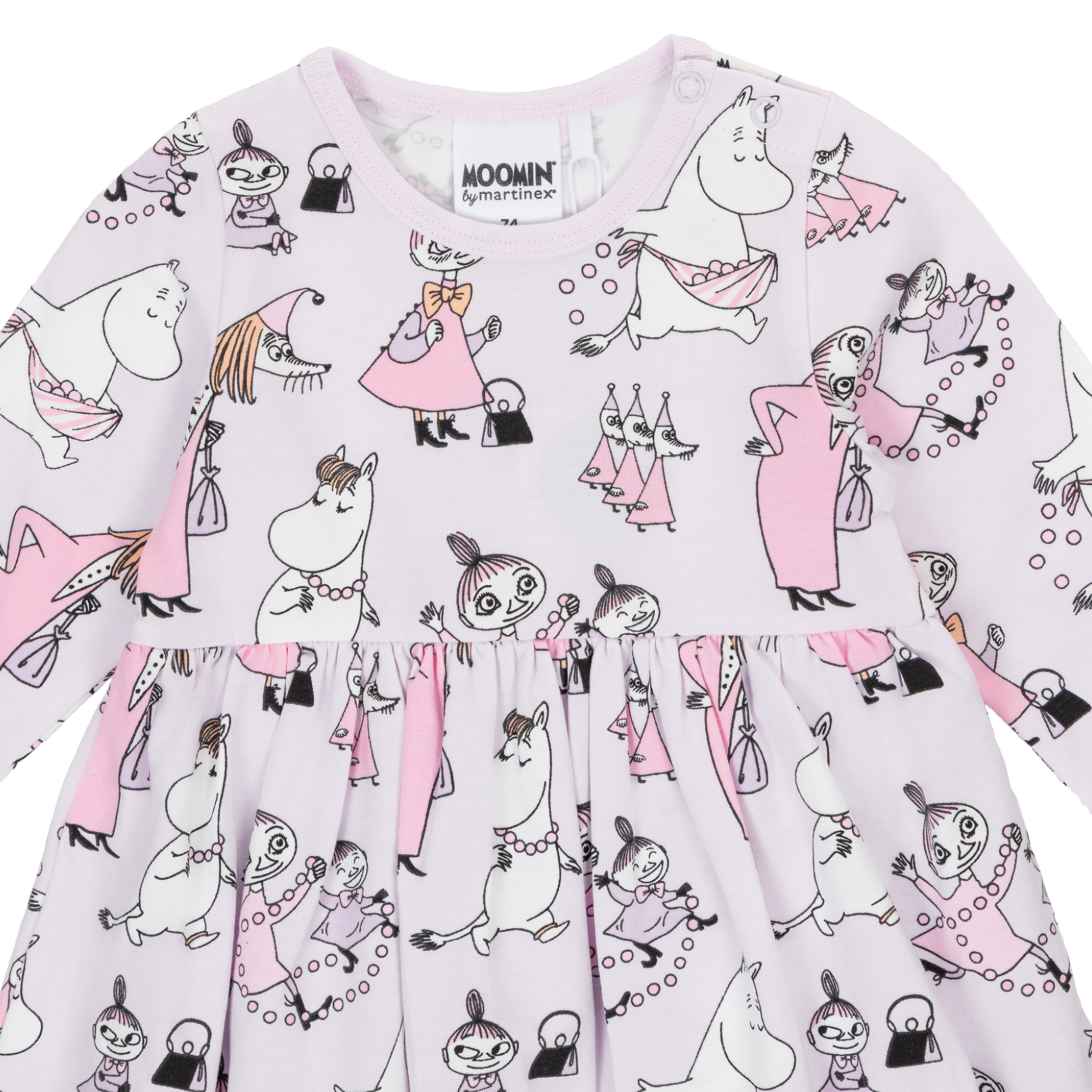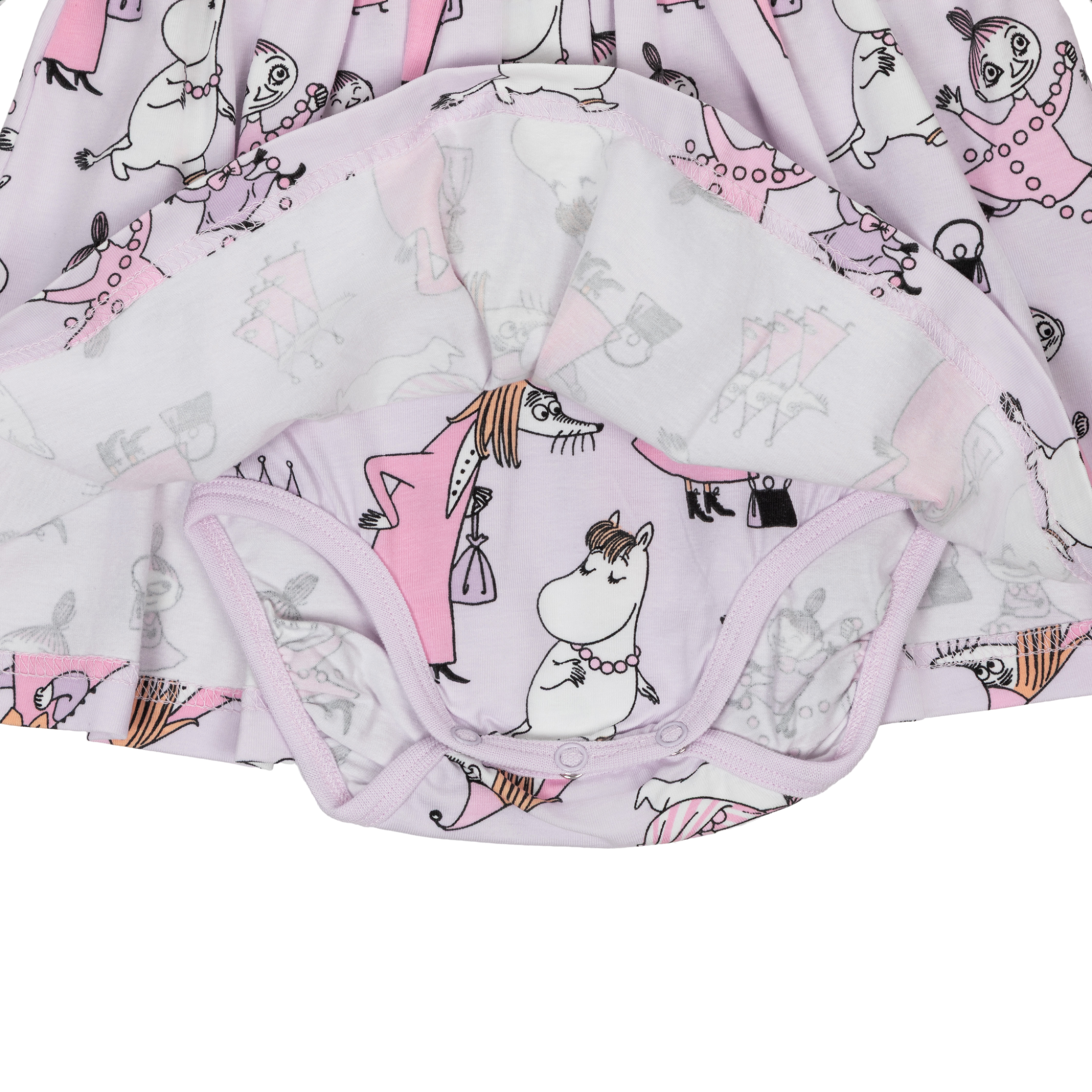 Vauvojen pehmeä liilan värinen Muumi-bodymekko hurmaavalla Helmileikki-kuosilla on valmistettu laadukkaasta luomupuuvillasta, joka takaa miellyttävän ja pehmeän tunteen herkkää vauvan ihoa vasten. Mekossa on pitkät hihat ja pukemista helpottavat painonapit toisella olkapäällä, ja helma on muotoiltu mukavasti liikkuvalle vauvalle. Haaraosassa olevat painonapit helpottavat vaipanvaihtoa. Tämä vauvan Muumi-bodymekko sopii ihanteellisesti arkeen, juhlaan tai lahjaksi. Pehmeä ja joustava materiaali varmistaa mukavuuden koko päivän ajan, ja suloisen liilan värin sekä Helmileikki-kuosin ansiosta mekko näyttää hurmaavalta pienokaisen päällä.
