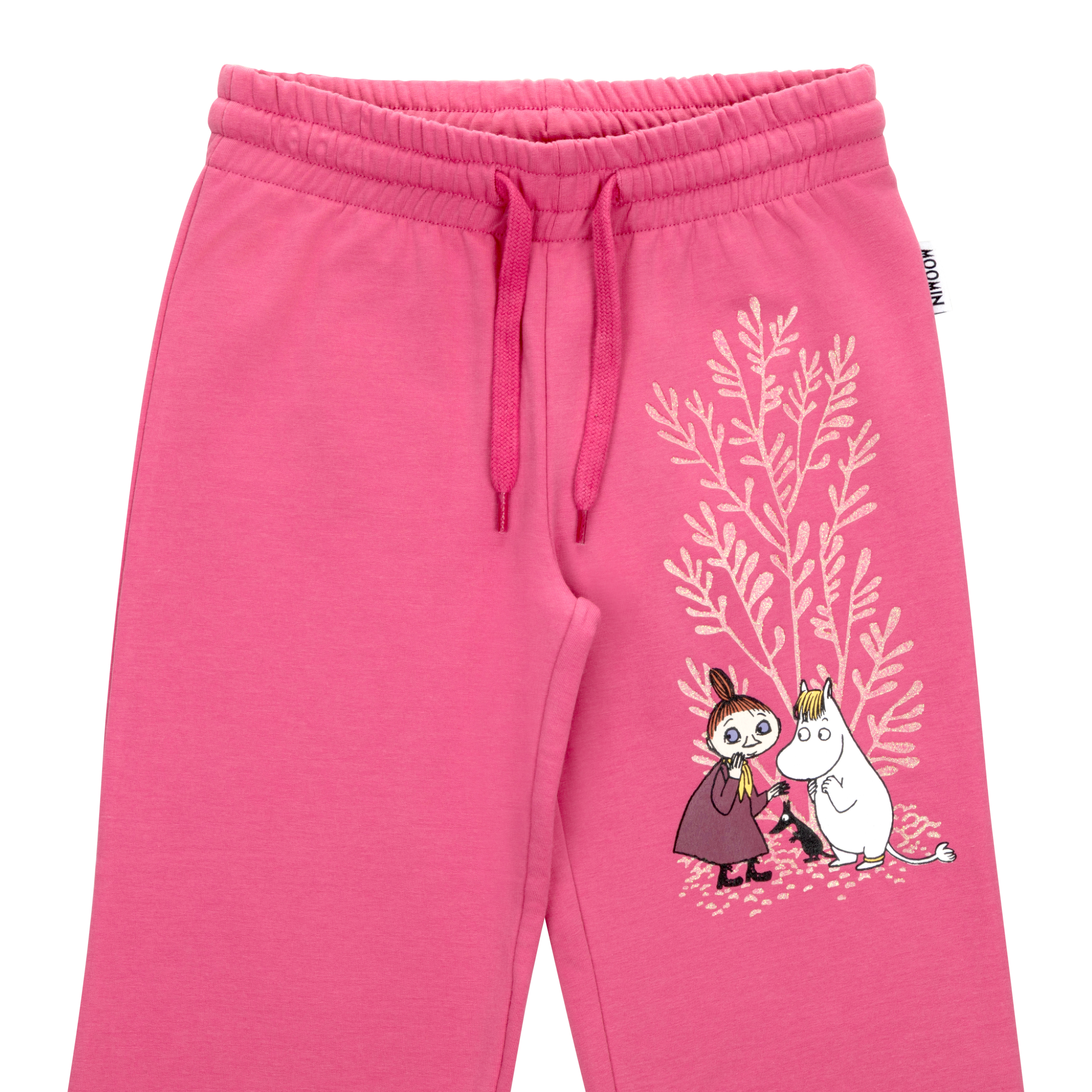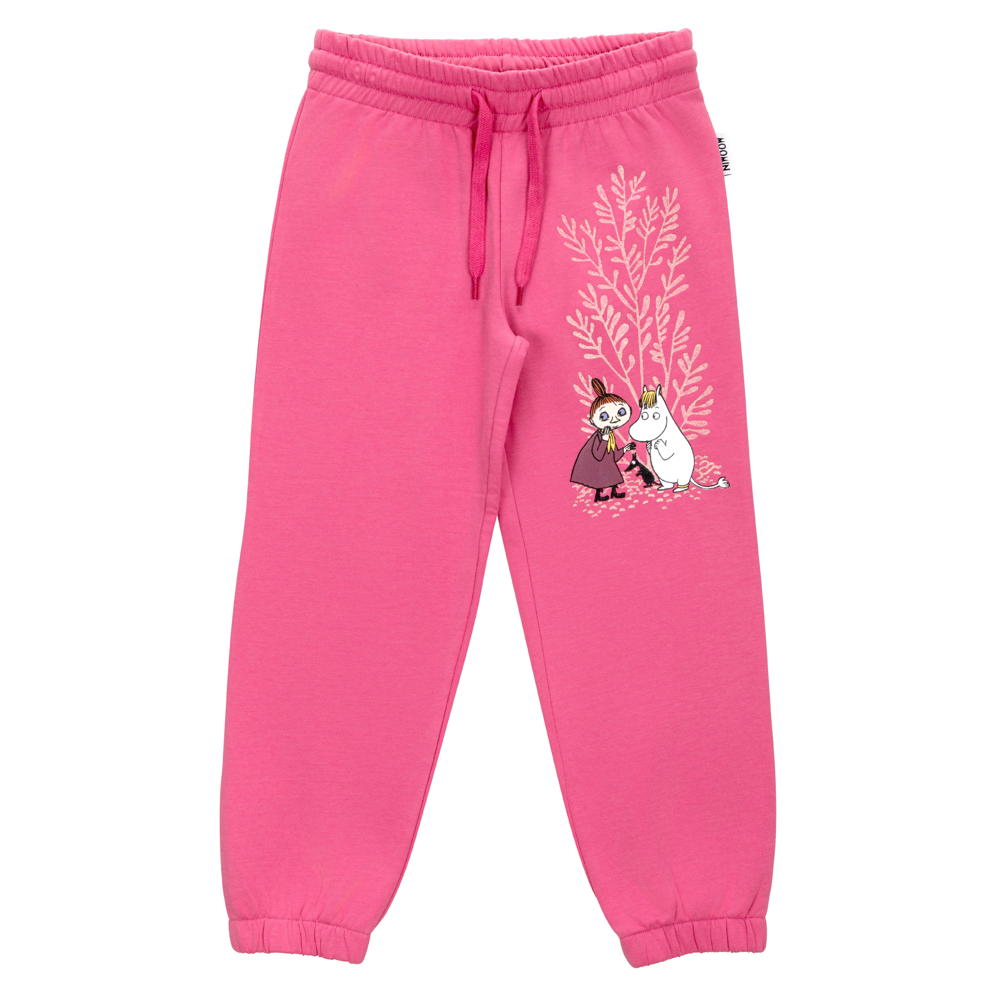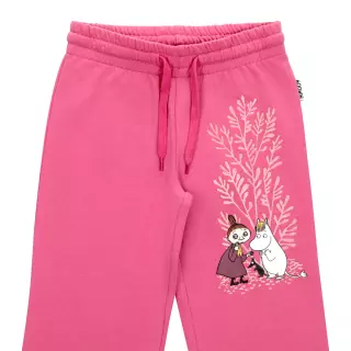 Lasten pitkälahkeiset Muumi collegehousut, joissa on joustava vyötärö kiristysnauhalla, kuminauhat lahkeensuissa ja pehmeäksi harjattu sisäpuoli. Toisessa reidessä on ihana kuva Niiskuneidistä ja Mymmelistä.