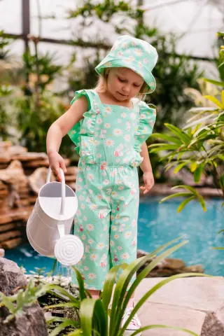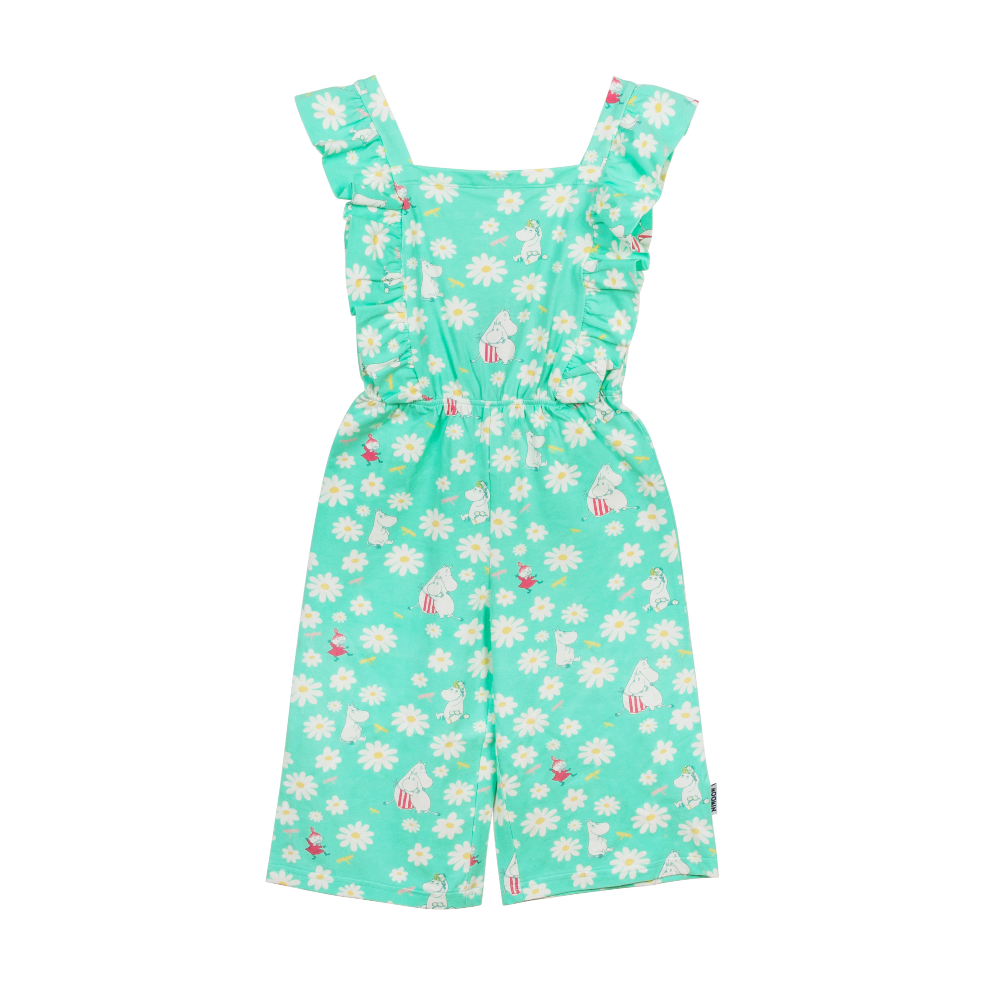 Hihaton Muumi haalari, jossa on suloiset frillat olalla, kaunis malli sekä capripituiset, leveät lahkeet. Haalarin hurmaavan mintunvihreällä pohjalla on suloinen Luonnonkukka-kuosi.