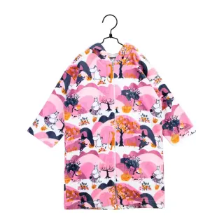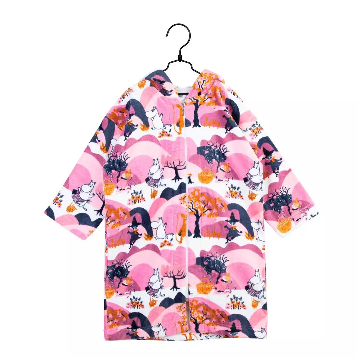 Lempeän värikäs kylpytakki, jossa on huppu, pitkät hihat ja vetoketju. Kylpytakissa on suloinen kuvitus Muumilaakson väestä ihastuttavasti kumpuilevassa laaksossa.