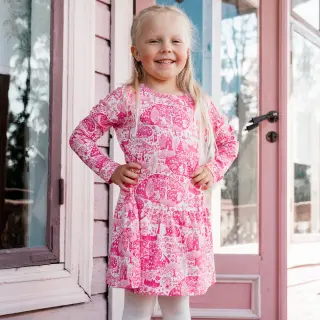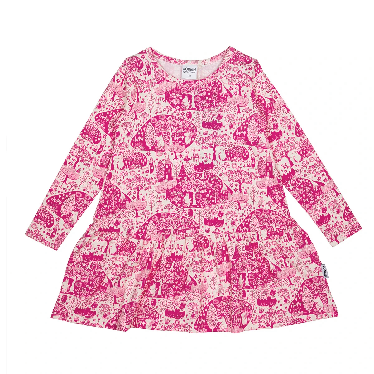 Ihastuttavan pinkkivalkoinen lasten pitkähihainen Muumi mekko, jossa on A-linjainen malli ja helmassa frilla. Mekon luonnonvalkoisella pohjalla on paljon yksityiskohtia sisältävä pinkki Puisto-kuosi, josta hehkuu Muumien luojan, Tove Janssonin alkuperäisten kuvien tunnelma.