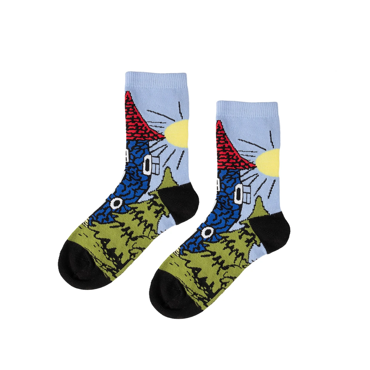 Hurmaavat lasten Muumi-sukat, joita koristaa koko etuosan kokoinen kuva Muumitalosta. Sukissa on pitkähkö varsi, ja ne pysyvät hyvin jalassa.
