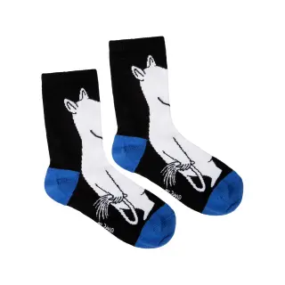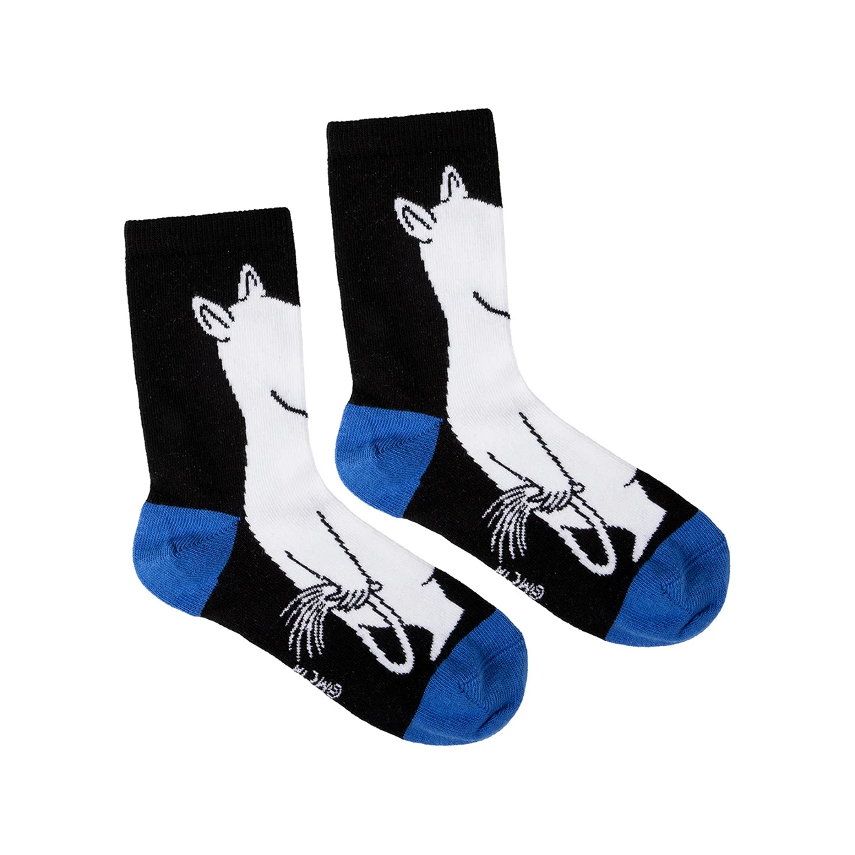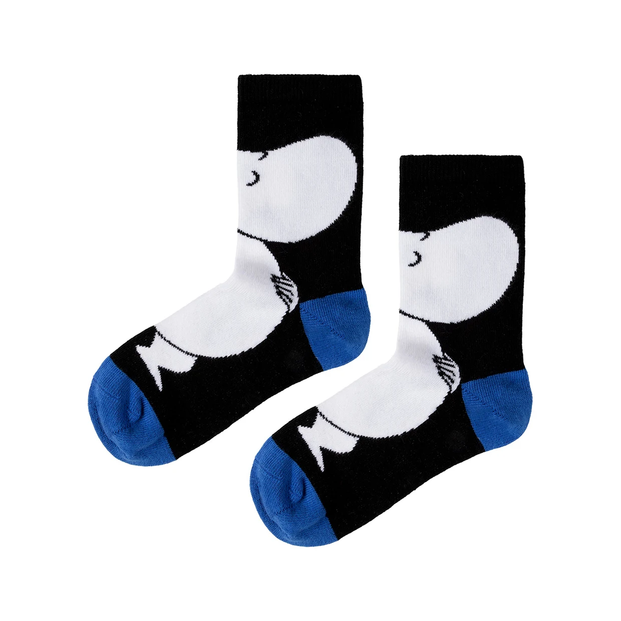 Hurmaavat lasten mustapohjaiset Muumi-sukat, joita koristaa koko etuosan kokoinen kuva nokkelasta Muumipeikosta. Sukissa on pitkähkö varsi, ja ne pysyvät hyvin jalassa. Sukissa on pitkähkö varsi, ja ne pysyvät hyvin jalassa.