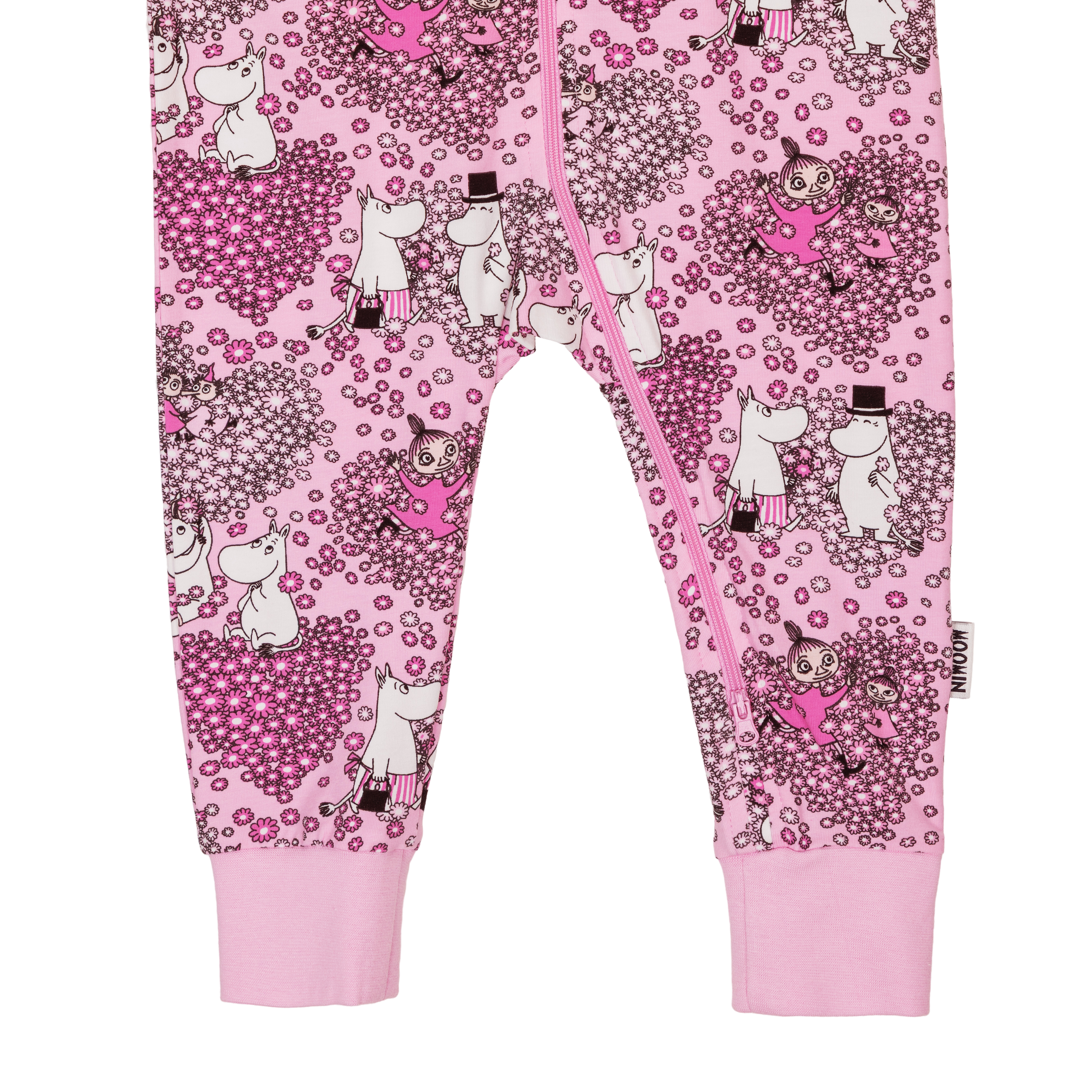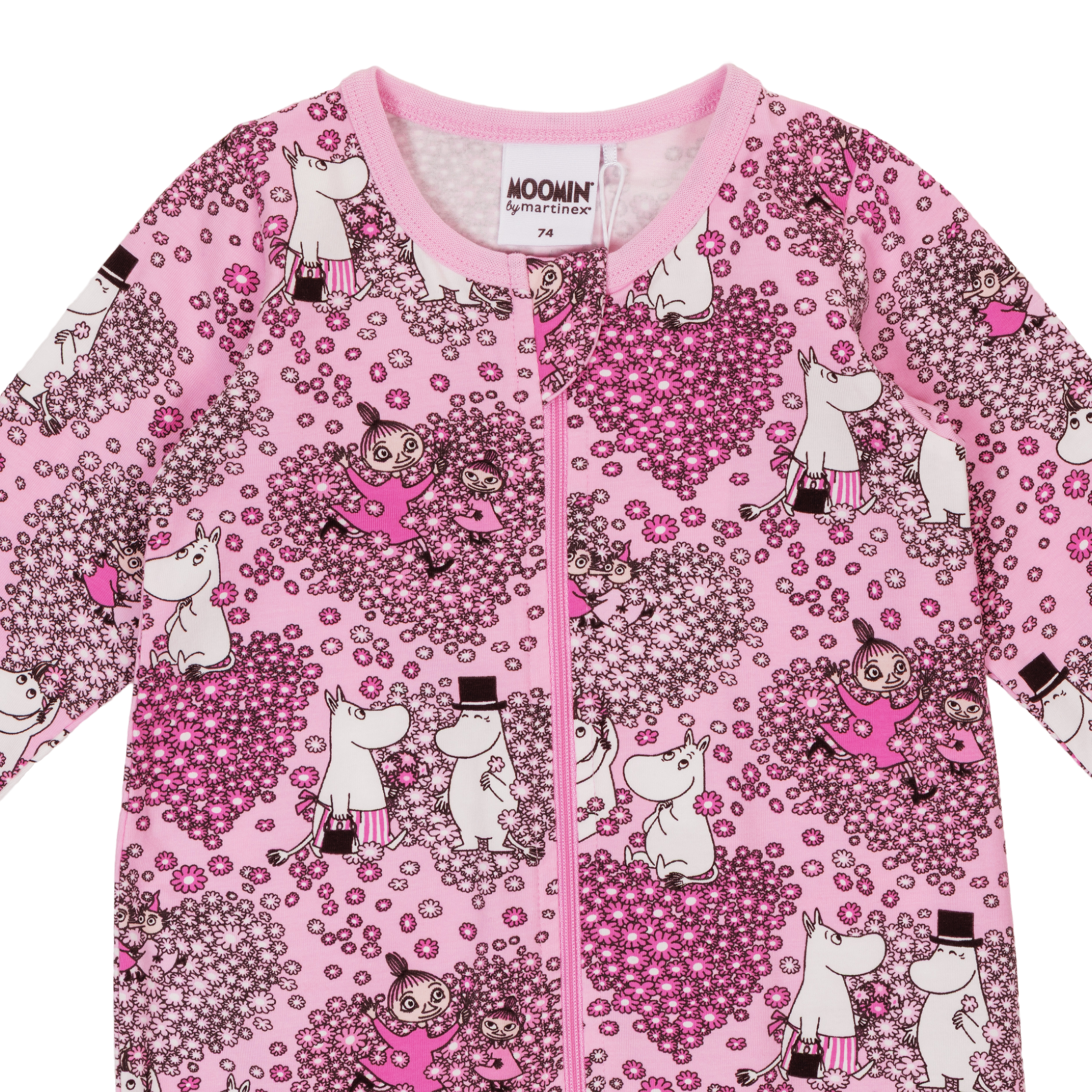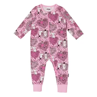 Pehmeä Muumi vauvojen unihaalari pitkillä hihoilla ja lahkeilla. Pyjamassa on pukemista helpottava pitkä kaksisuuntainen vetoketju. Haalaria koristaa hurmaava Ystävät-kuosi.