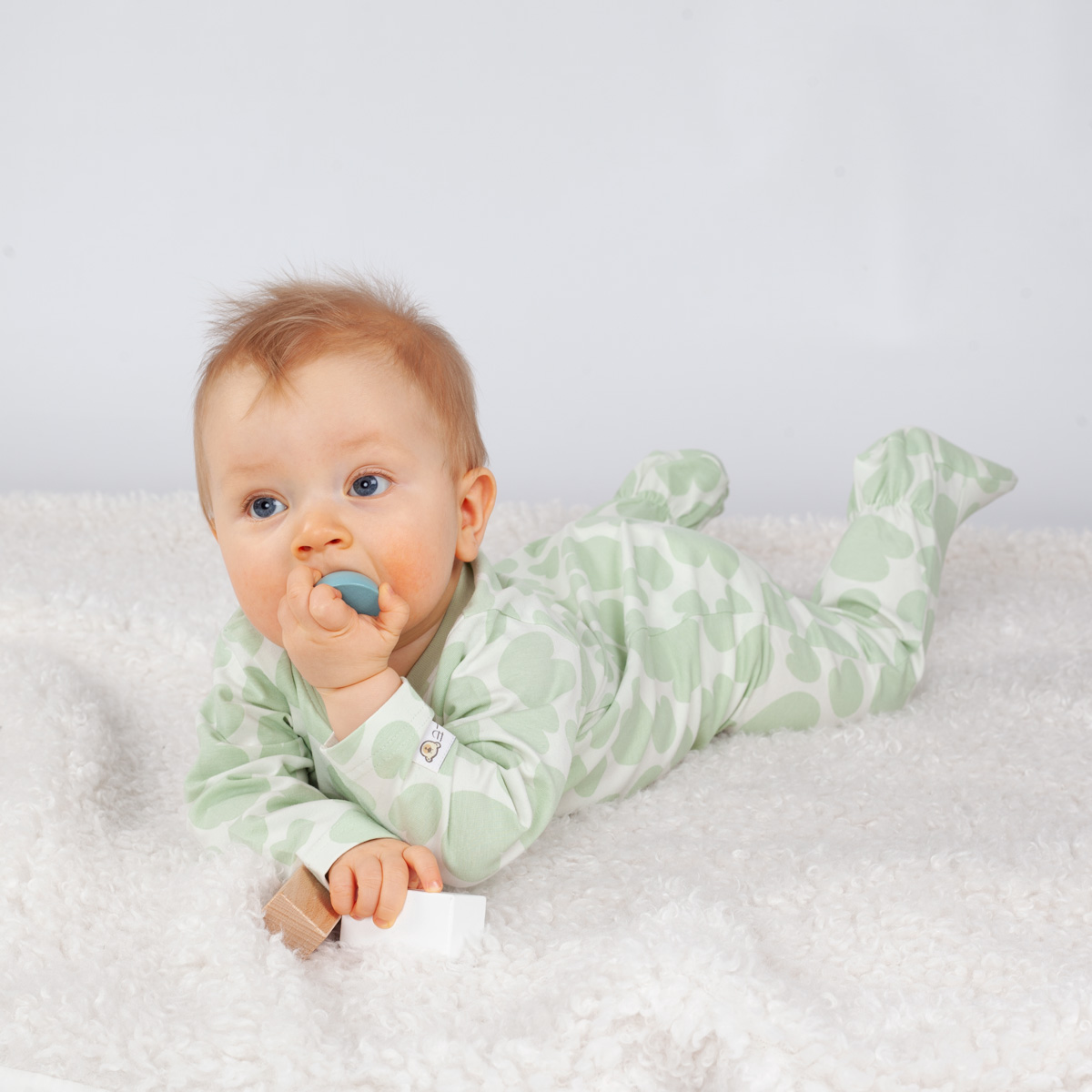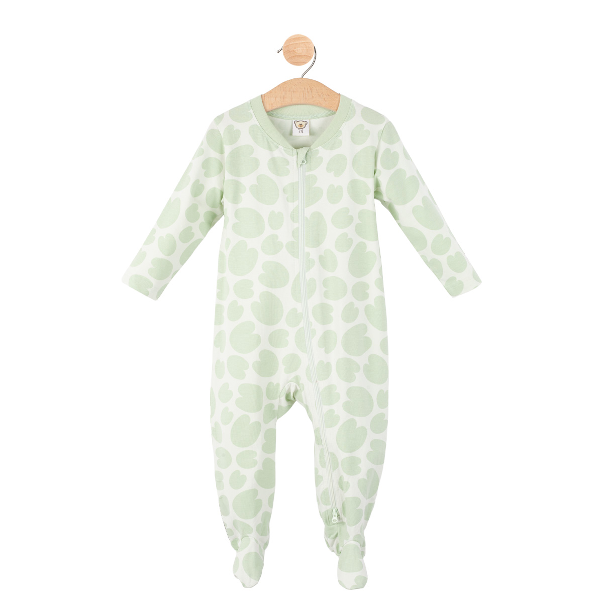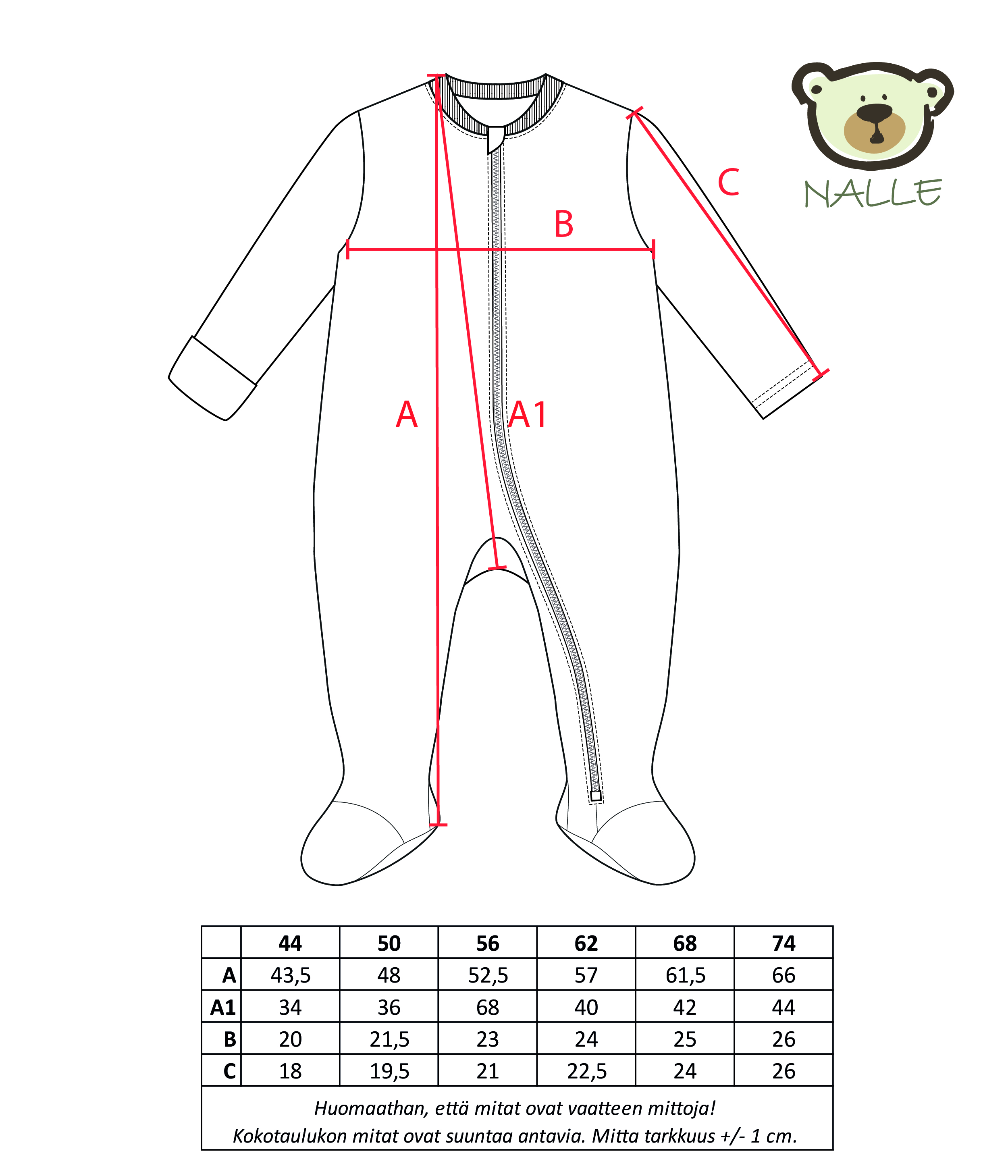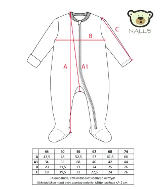 Tämä Nalle potkupuku on käytännöllinen vaate vauvan arkeen. Haalari on tehty luomupuuvillasta, joka tuntuu pehmeältä ihoa vasten. Kaksisuuntainen, pitkä vetoketju helpottaa ja nopeuttaa pukemista. Hihojen päät ovat käännettävät ko'oissa 44 cm - 62 cm.