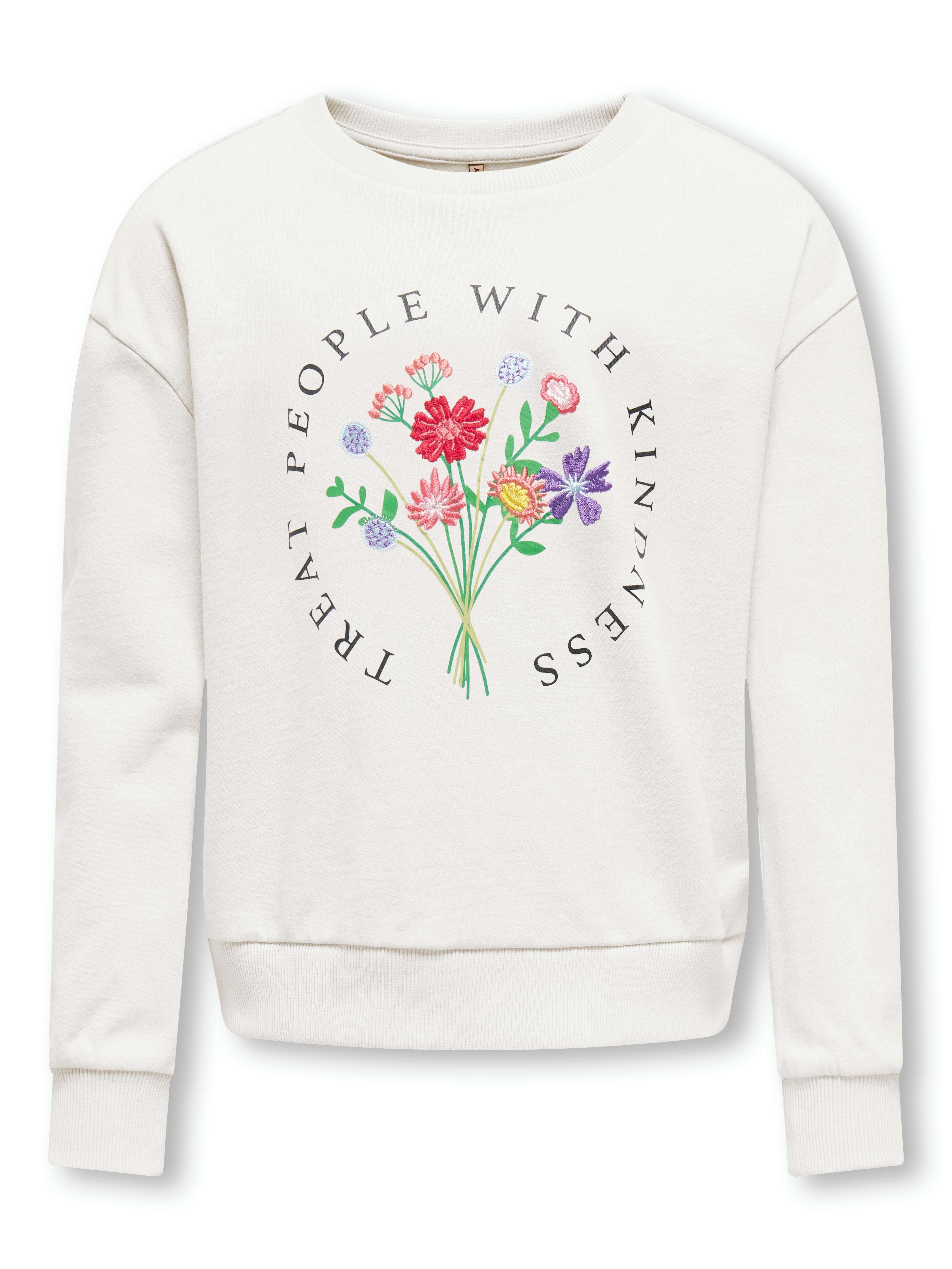 Ihastuttava kevään uutuus, pehmeä ja mukava ONLY KIDS collegepaita arjen rientoihin. Tämä collegepaita sopii rentoon päivään tai lisäkerrokseksi kylmiin päiviin. Paidan malli on regular fit, siinä on pyöreä pääntie, pitkät hihat ja kaunis kukkakuvitus tekstillä "Treat people with kindness".