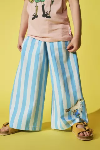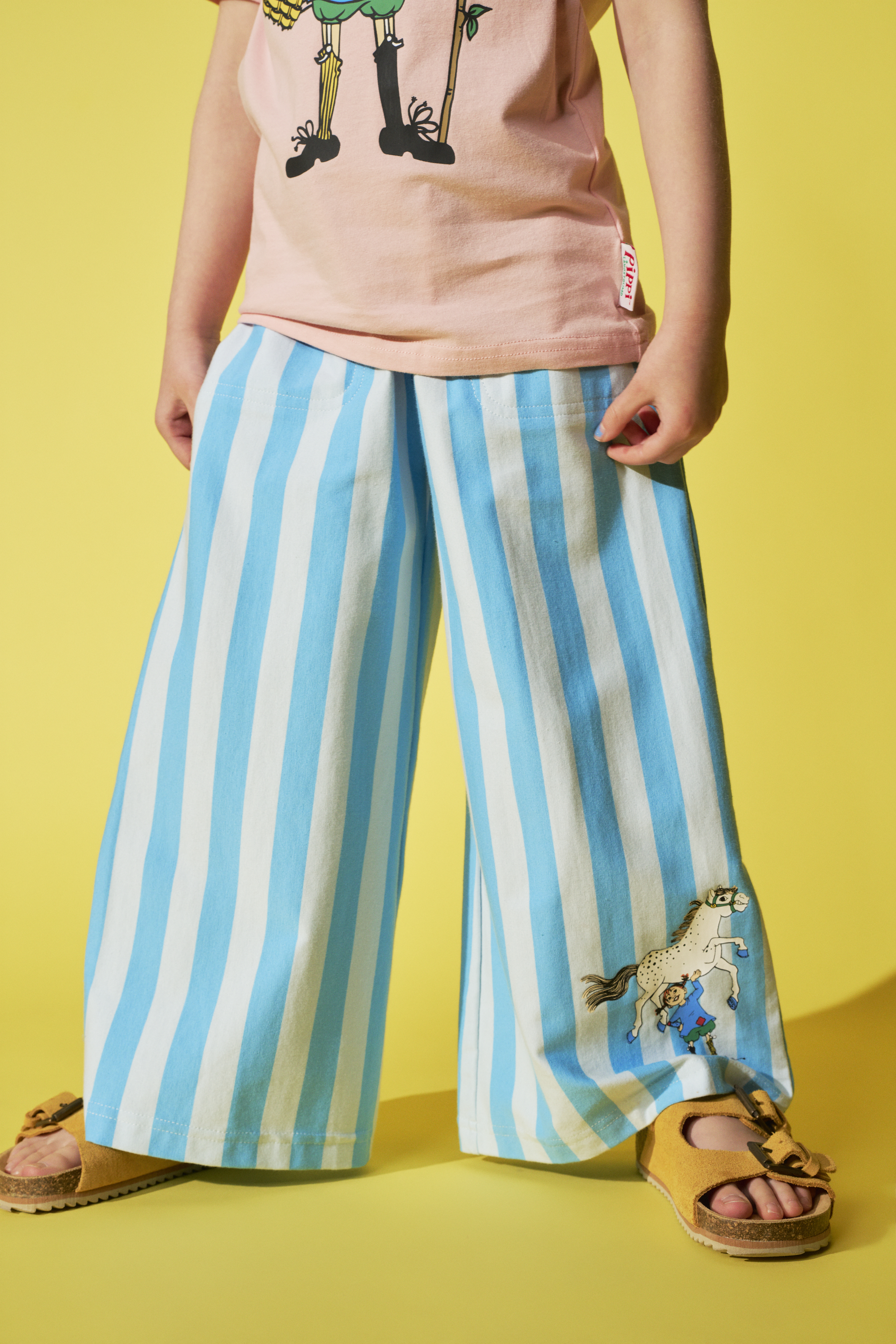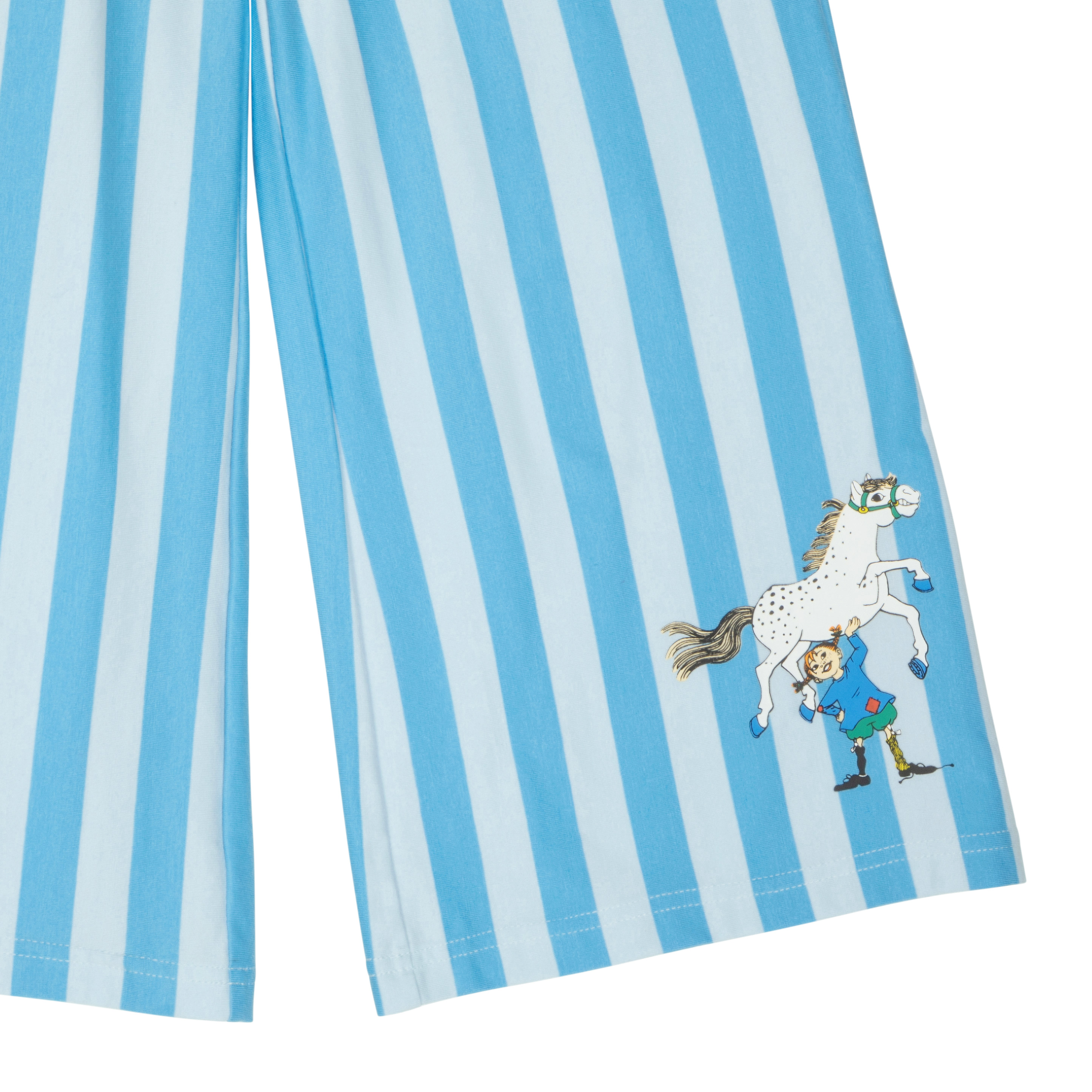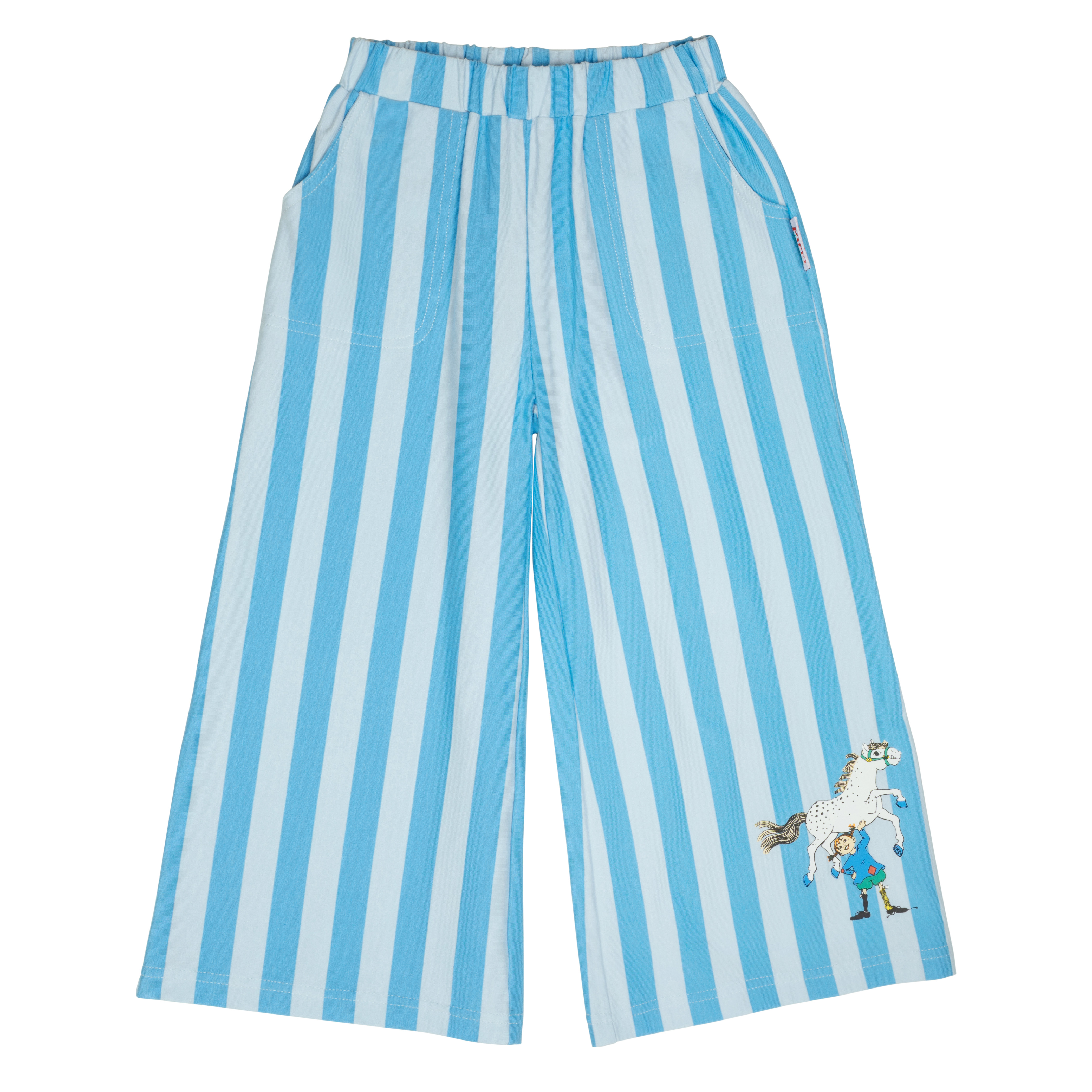 Lasten pehmeät, raidalliset Peppi Pitkätossu -aiheiset housut. Housuissa on suorat, leveät lahkeet, taskut ja joustava kuminauhavyötärö.