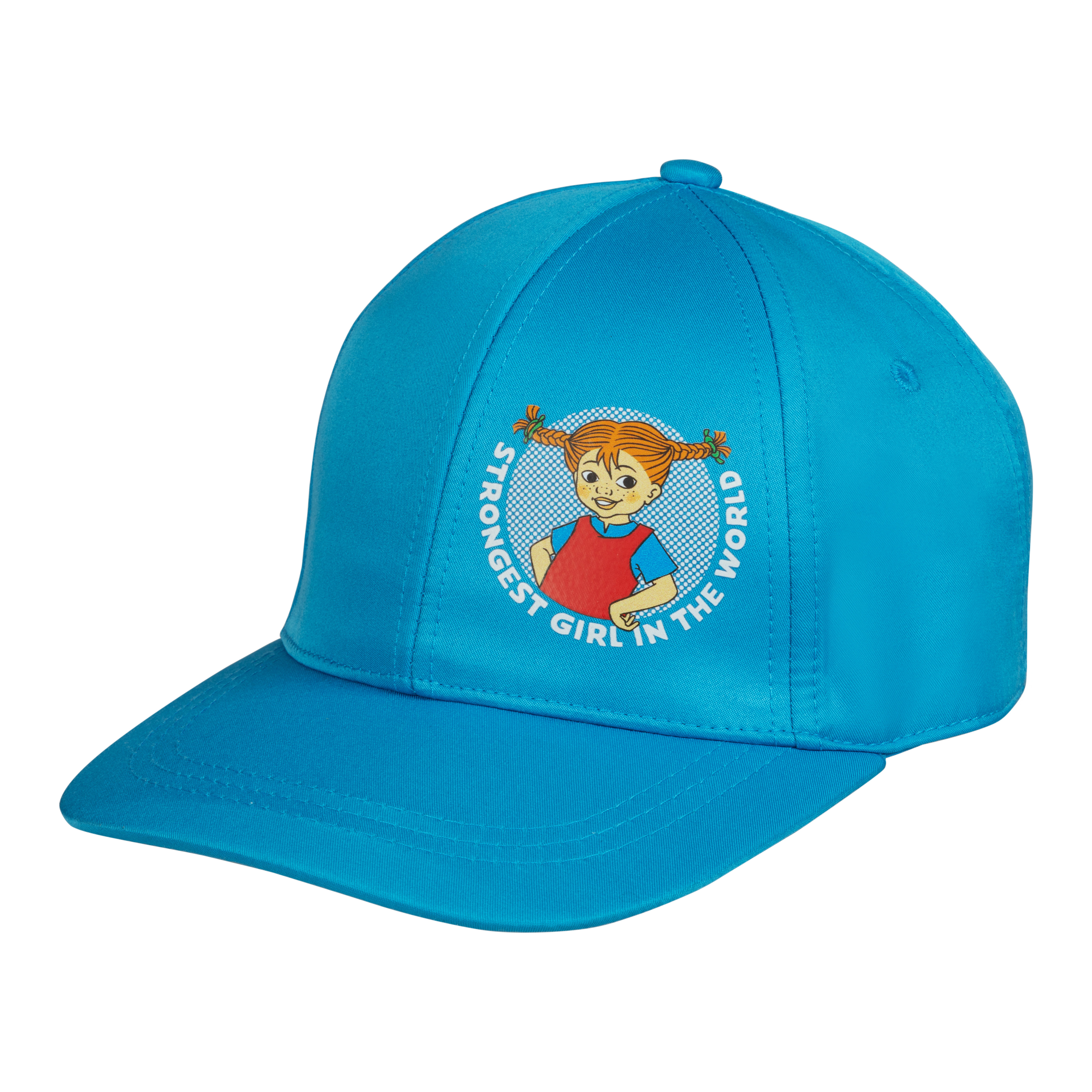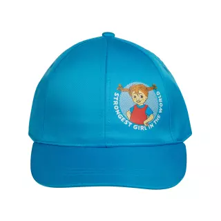 Lasten sininen Peppi Pitkätossu-aiheinen lippis on valmistettu kierrätetystä polyesteristä. Lippalakissa on kovitettu lippa ja tarranauhalla säädettävä päänympärys.