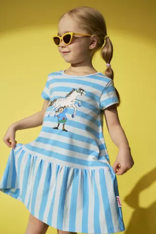 Lasten pehmeä, raidallinen Peppi Pitkätossu-aiheinen mekko. A-linjaisessa mekossa on lyhyet hihat, pyöreä pääntie ja leveä pystyraitainen frillahelma. Edessä hauska printti, jossa Peppi esittelee voimiaan!