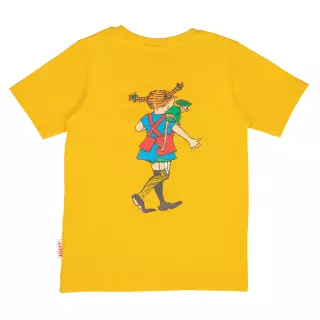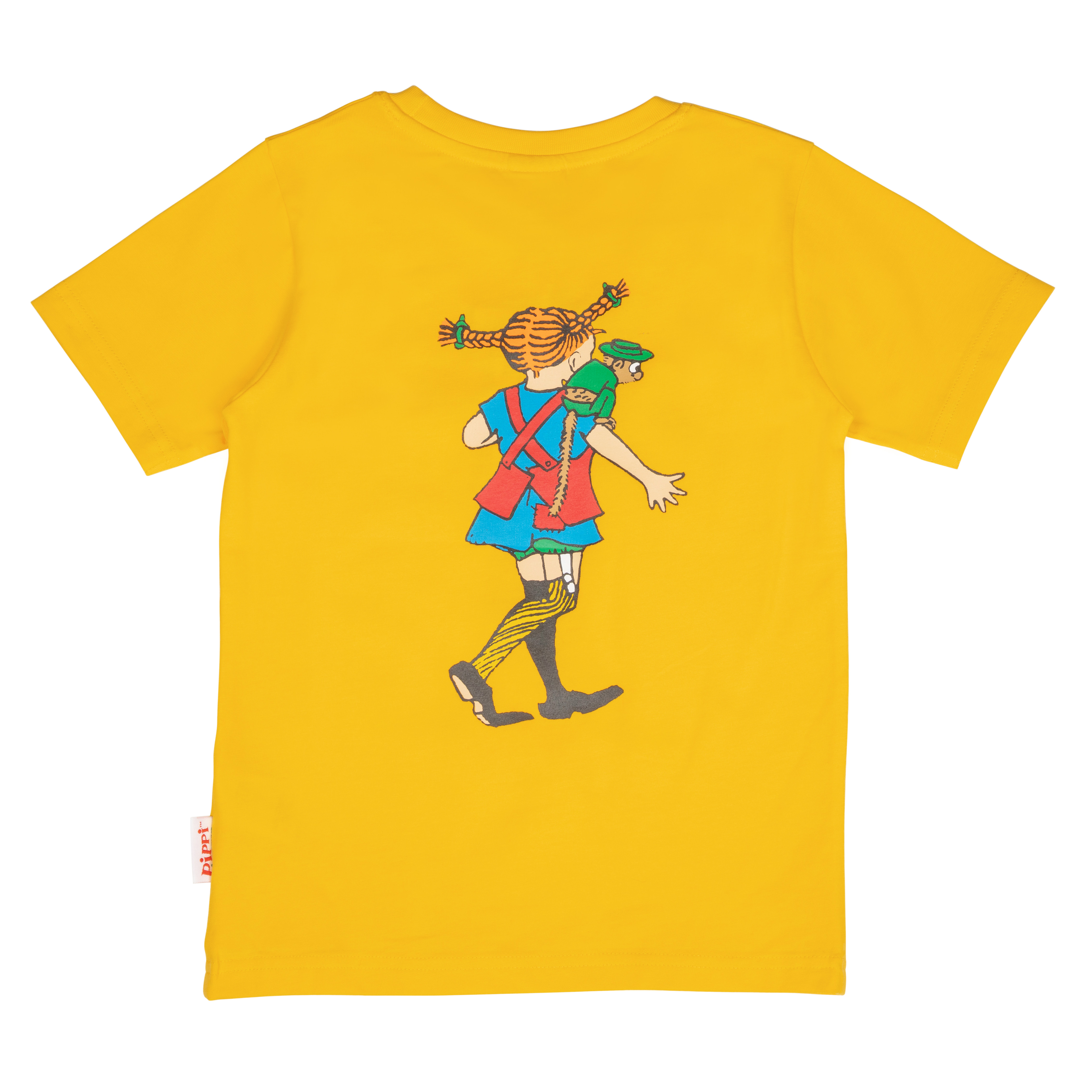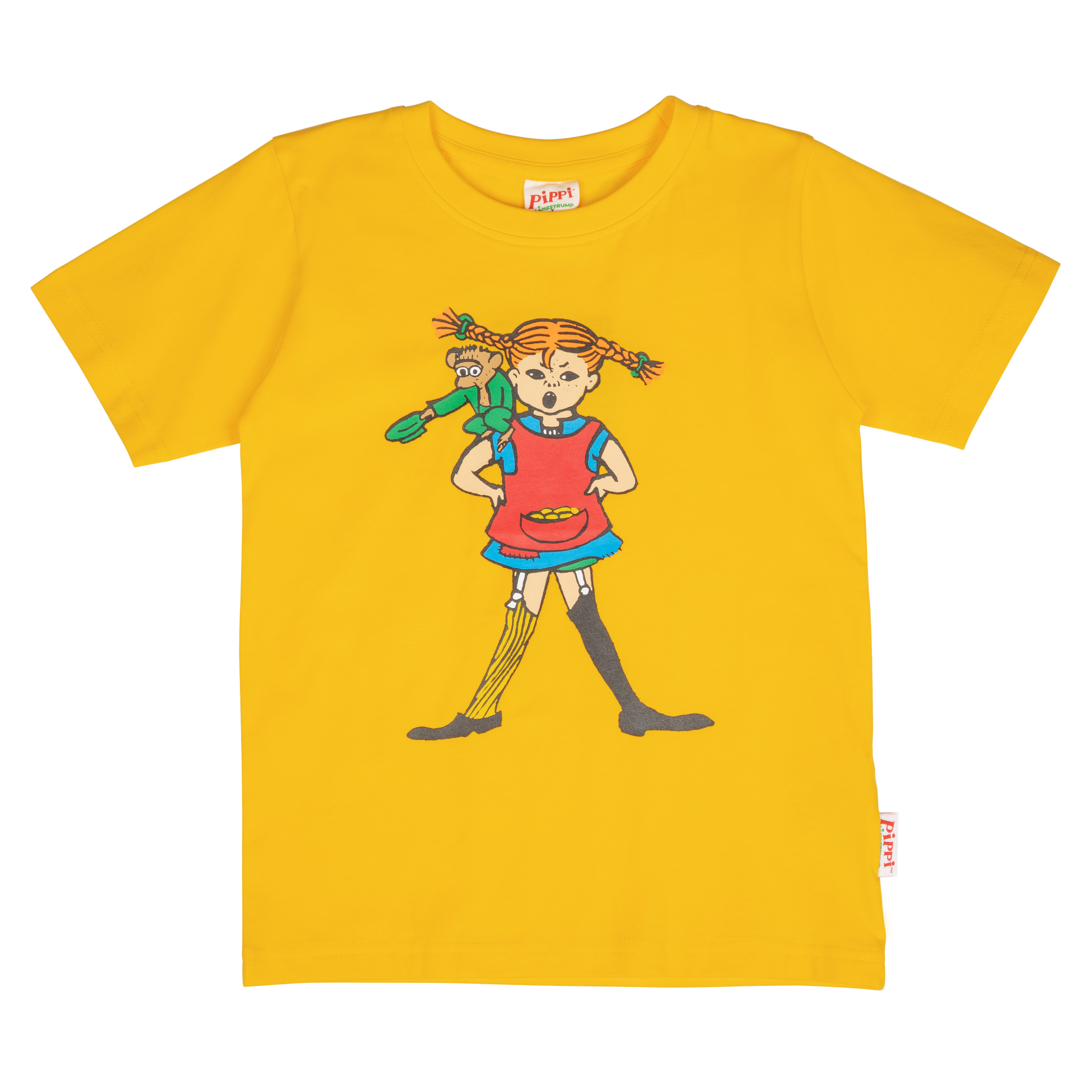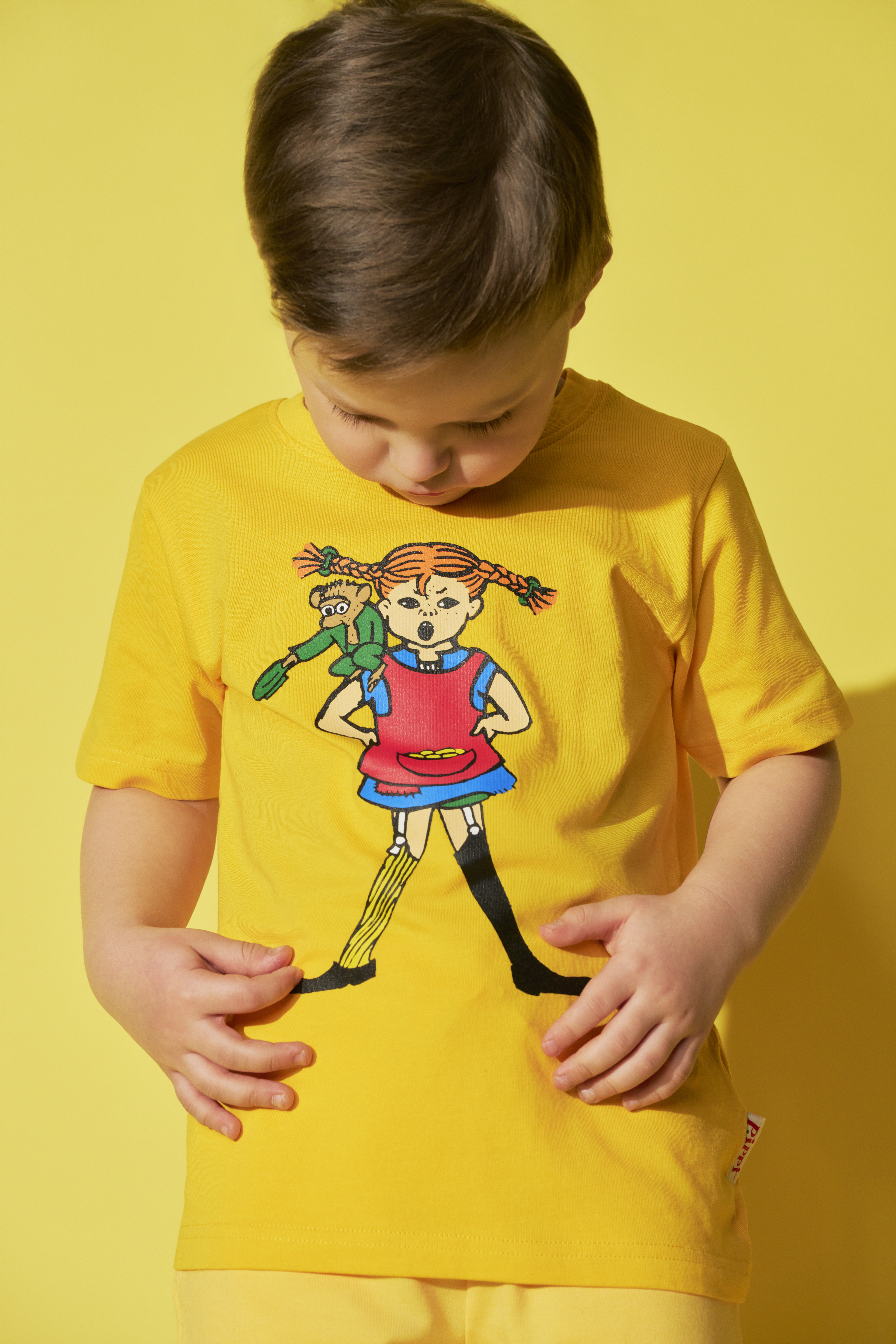 Lasten pehmeä Peppi Pitkätossu -aiheinen t-paita. Suoralinjaisessa paidassa on lyhyet hihat ja pyöreä pääntie. Paidassa on hauska printti Pepistä edestä ja takaa.