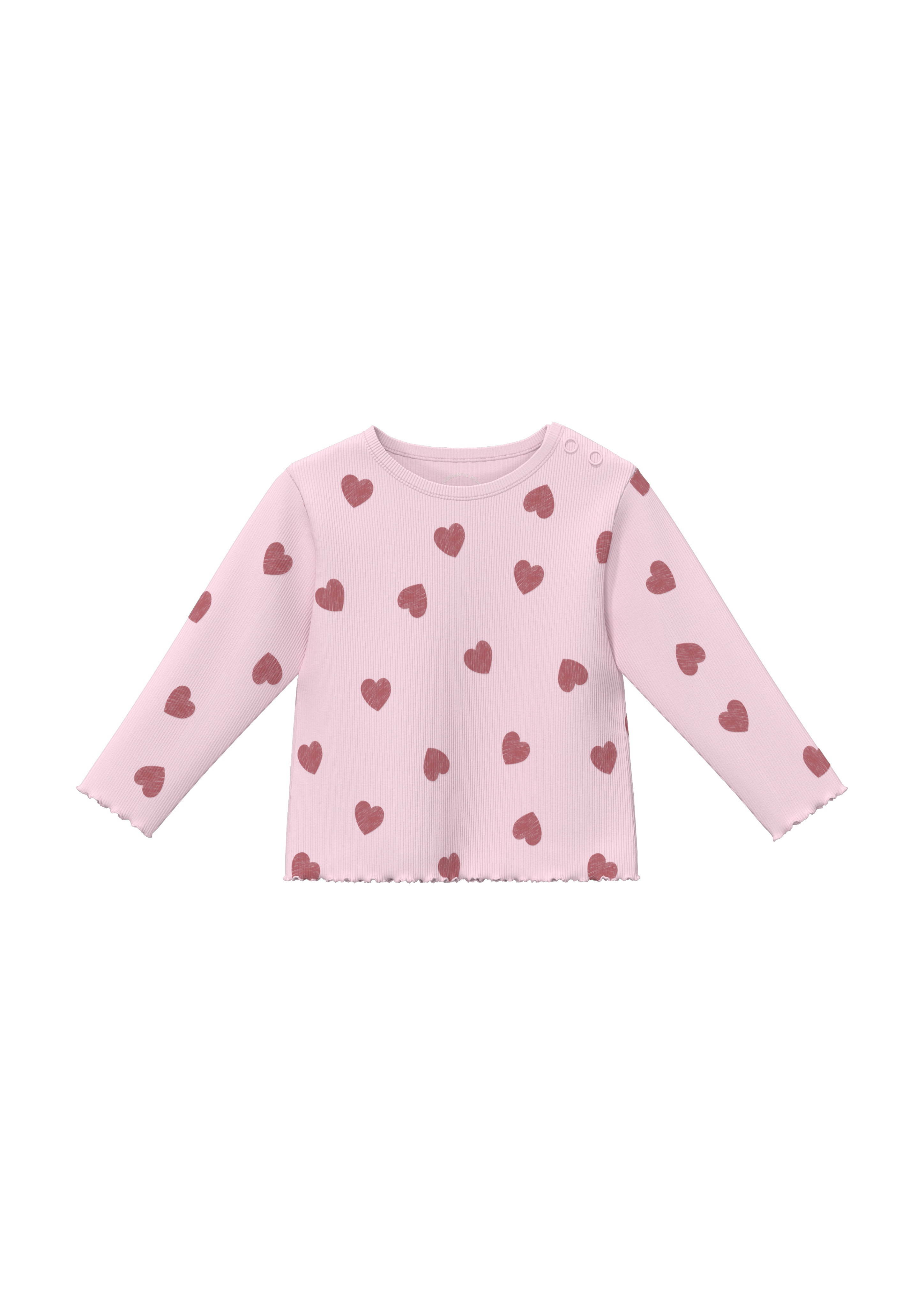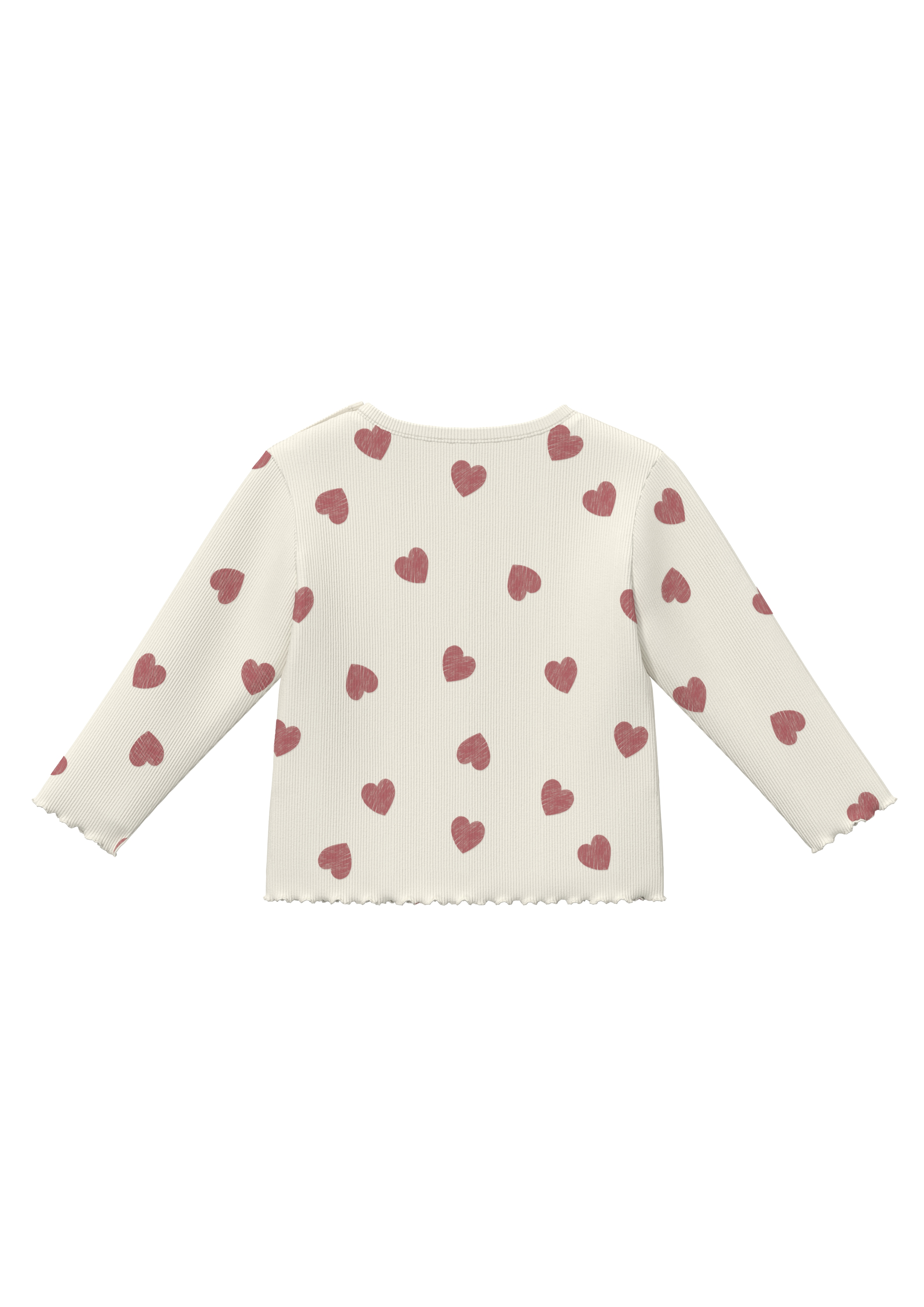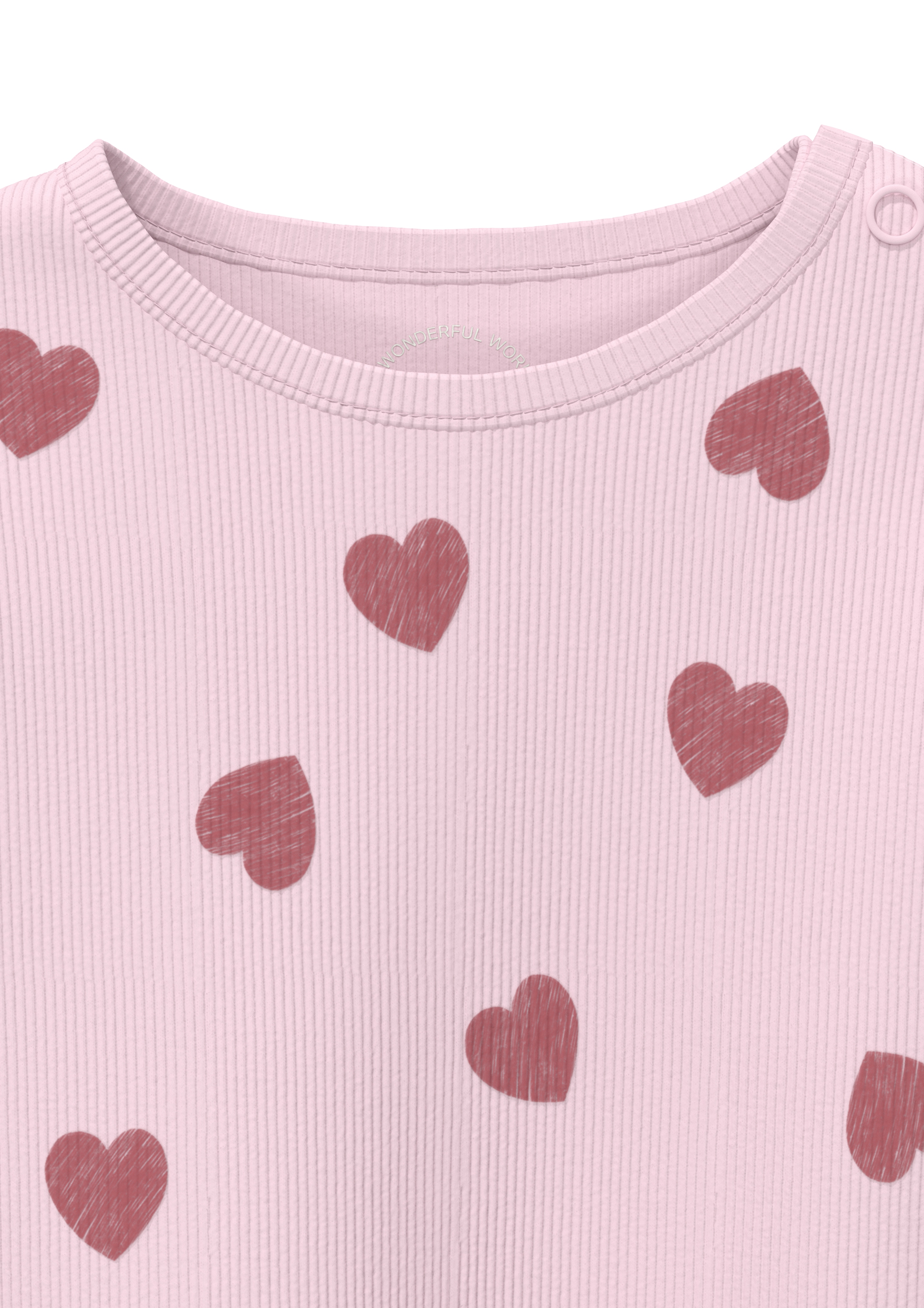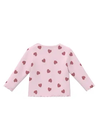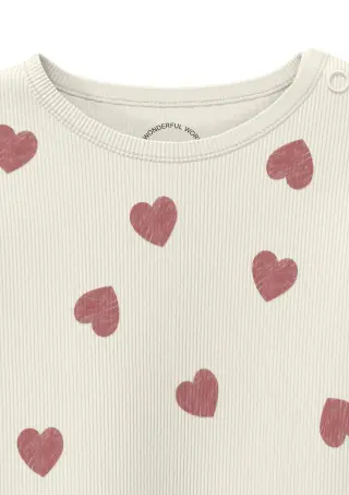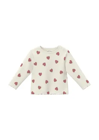 Ihastuttava s.Oliverin pitkähihainen, ribbineuloksinen paita sydänprintillä. Tämä pehmeä ribbineulospaita on koristeltu suloisella, koko mekon kattavalla sydänkuosilla sekä olkapäällä oleva painonappikiinnitys on lisätty helpottamaan pukemista. Rypytetyt reunat viimeistelevät paidan tyylikkäällä ja herkällä tavalla. Sopiva valinta kerrospukeutumiseen viileämmillä päivillä tai yksinään pidettäväksi lämpimämmällä säällä.