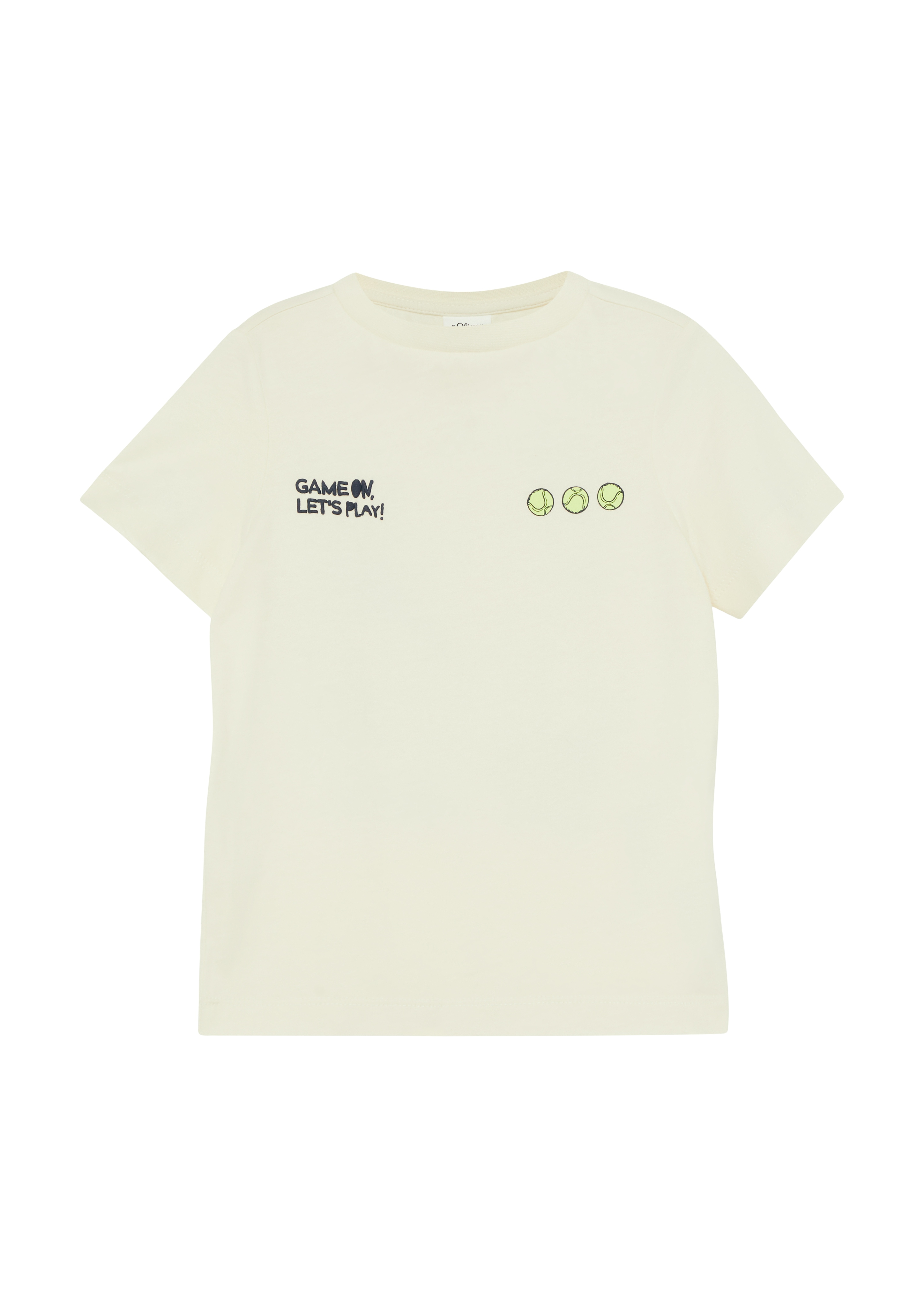 Pirteä s.Oliver jersey T-paita, jossa on huomiota herättävä etupainatus "Game on, Let's Play!" tekstillä sekä takana iso kuva tennispallo teemasta. Tämä paita sopii harrastajille sekä muutenkin arjen rientoihin! Paidan normaali istuvuus sekä pehmeä kangas takaa mukavuuden sekä hyvän istuvuuden koko päiväksi. Ribattu pyöreä pääntie viimeistelee tyylikkään lopputuloksen. Helppo yhdistää farkkujen tai shortsien kanssa, joten se sopii erinomaisesti kouluun, leikkitreffeille ja viikonloppuretkille.
