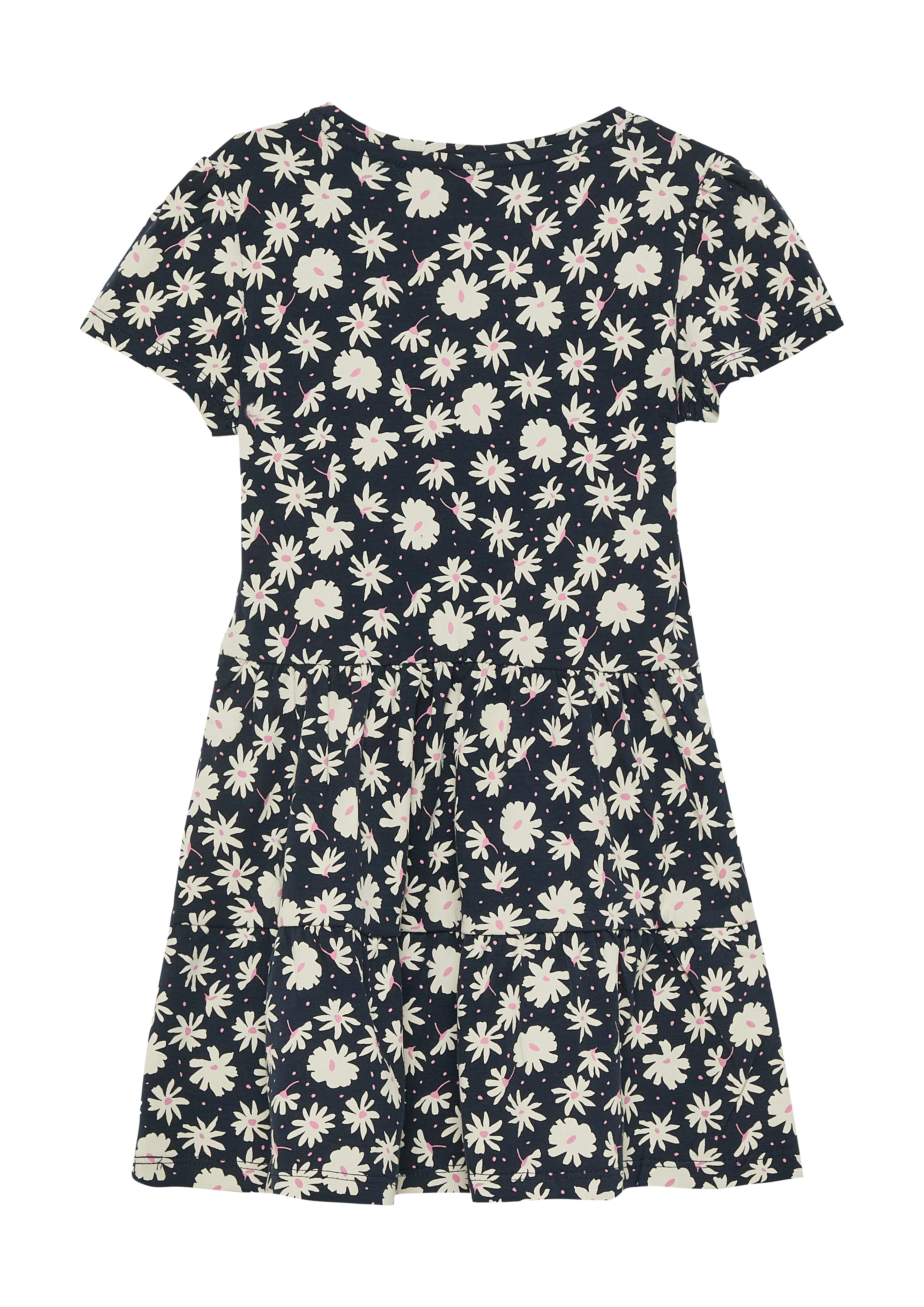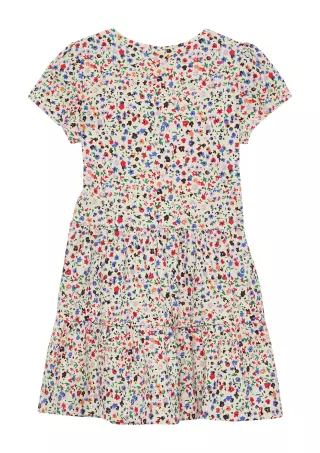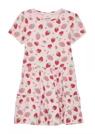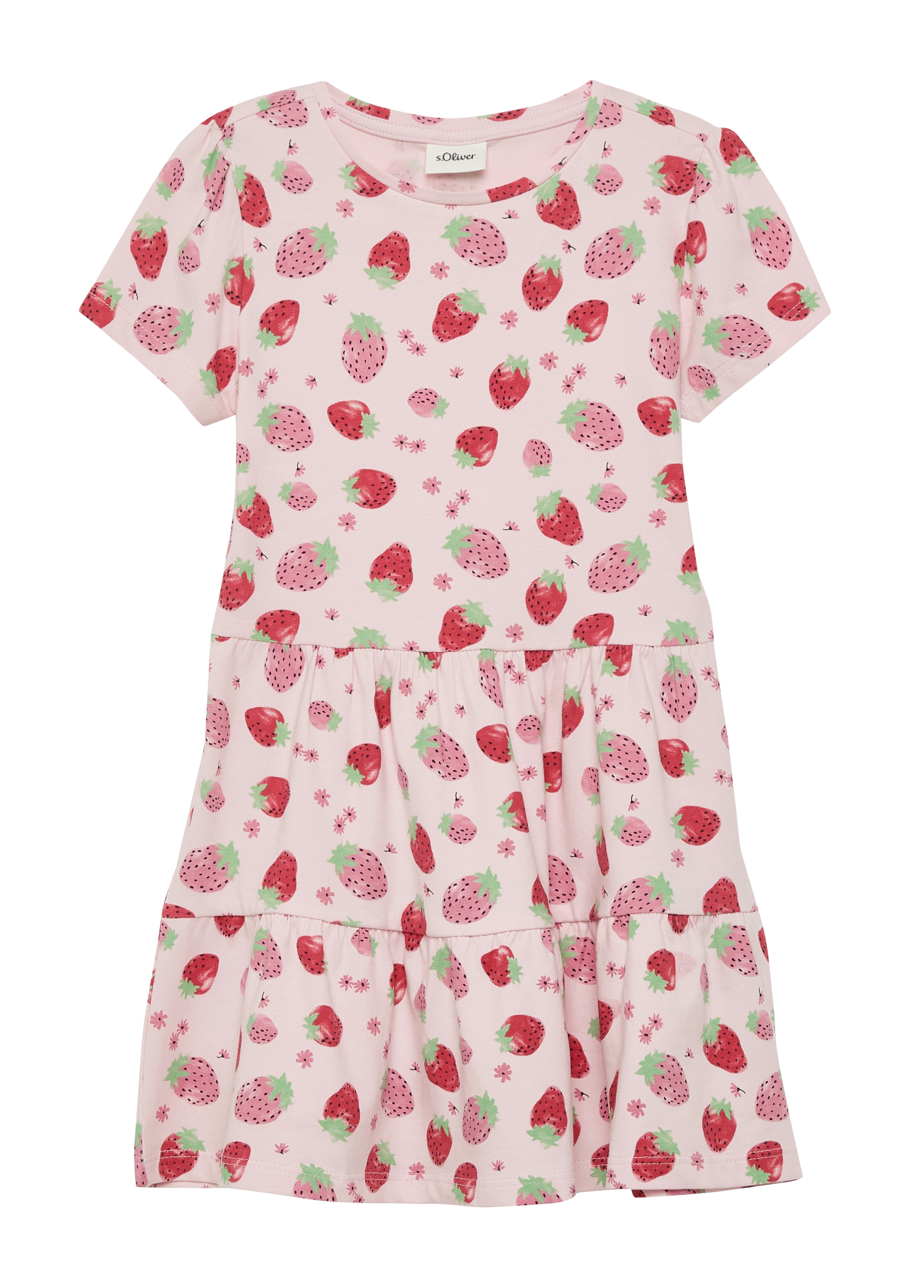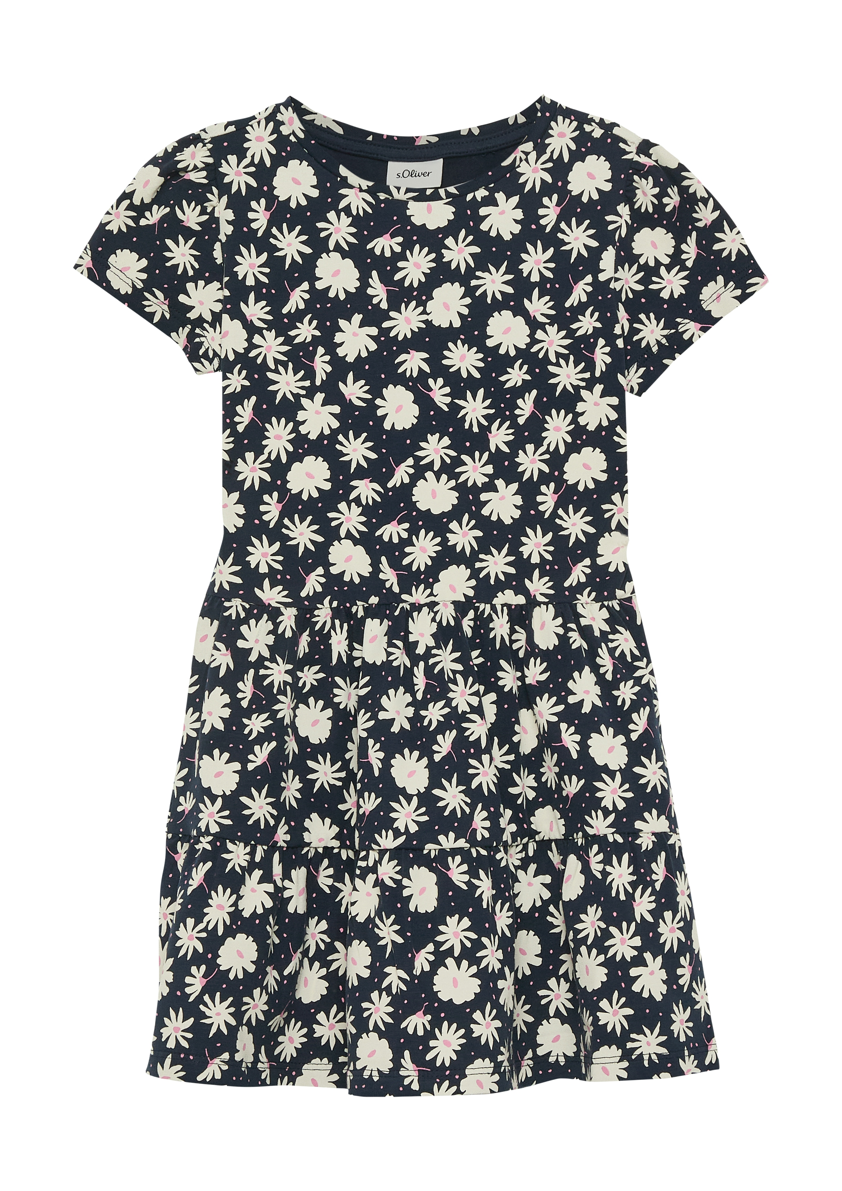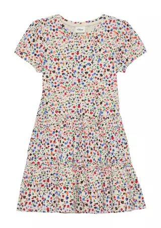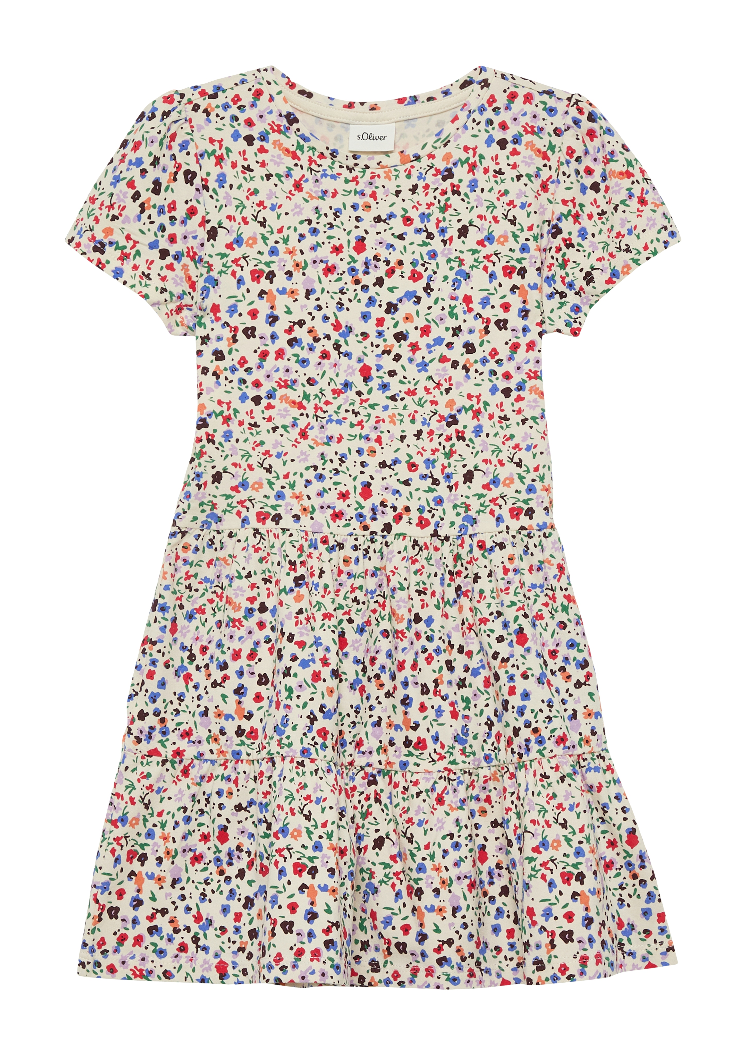 s.Oliver kuviollinen trikoomekko leikkisällä kauttaaltaan olevalla kuviolla sekä kerrostetuilla röyhelöillä luo kauniin kellomaisen siluetin. Pehmeä materiaali tuntuu miellyttävältä päällä koko päivän, ja suloiset puhvihihat tuovat asuun ihastuttavan yksityiskohdan.