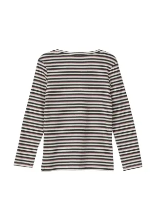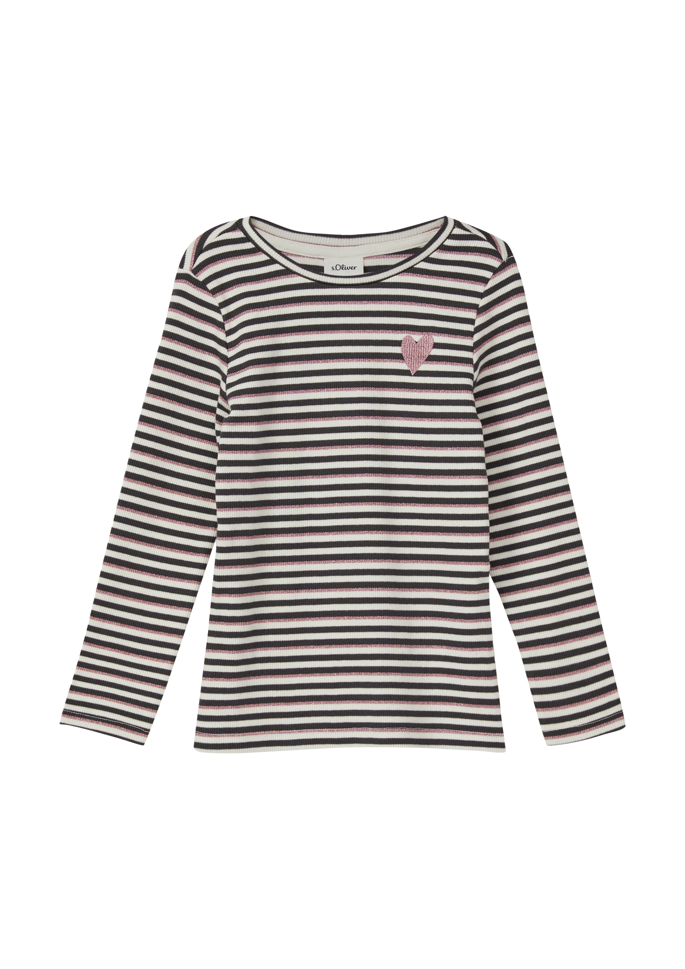 Pitkähihanen s.Oliver paita, jota koristaa kimaltavat raidat. Paidassa on kapea istuvuus, joustava ribbineulos materiaali ja pyöreä pääntie.