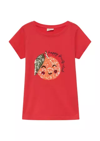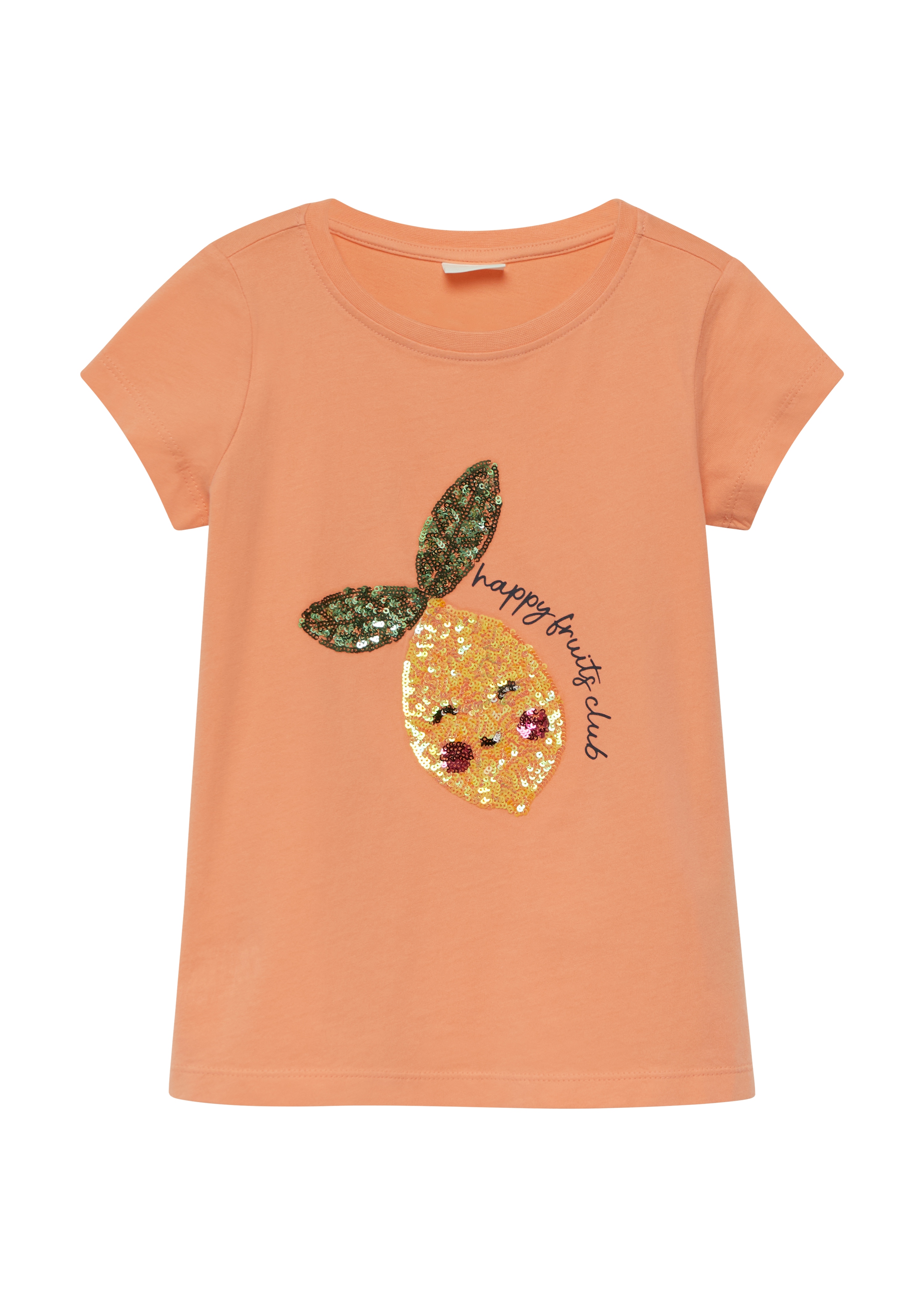 s.Oliver Sitrushedelmät on pehmeästä trikoosta valmistettu T-paita, joka tuo asuun leikkisää säihkettä näyttävällä paljettikuviollaan.