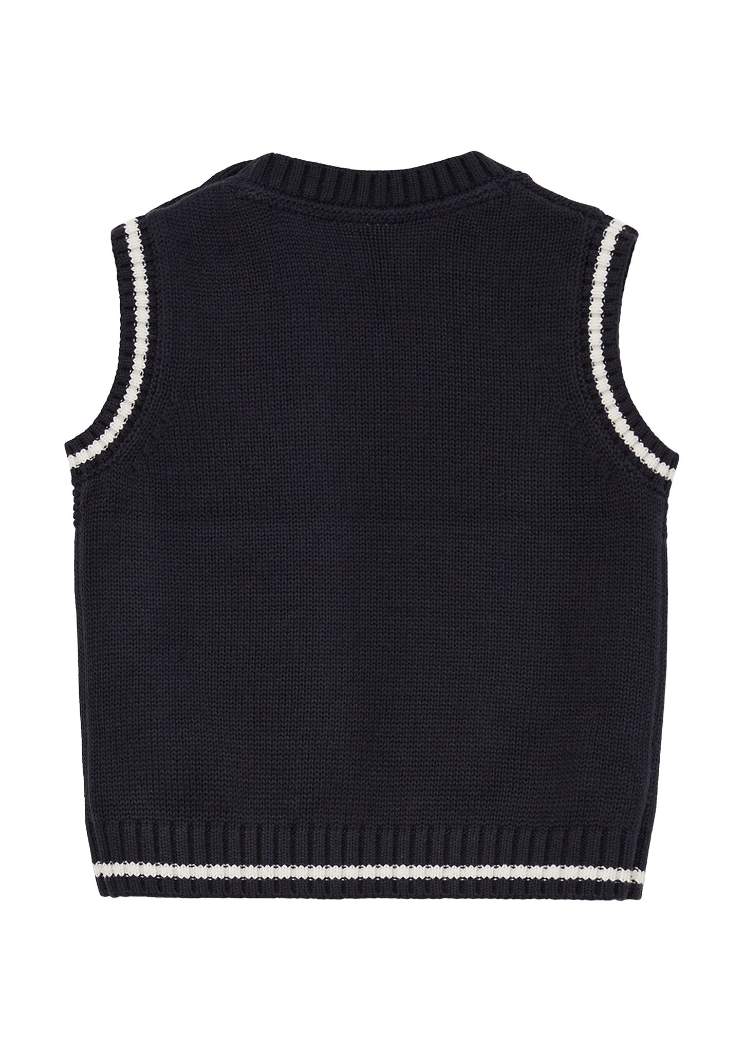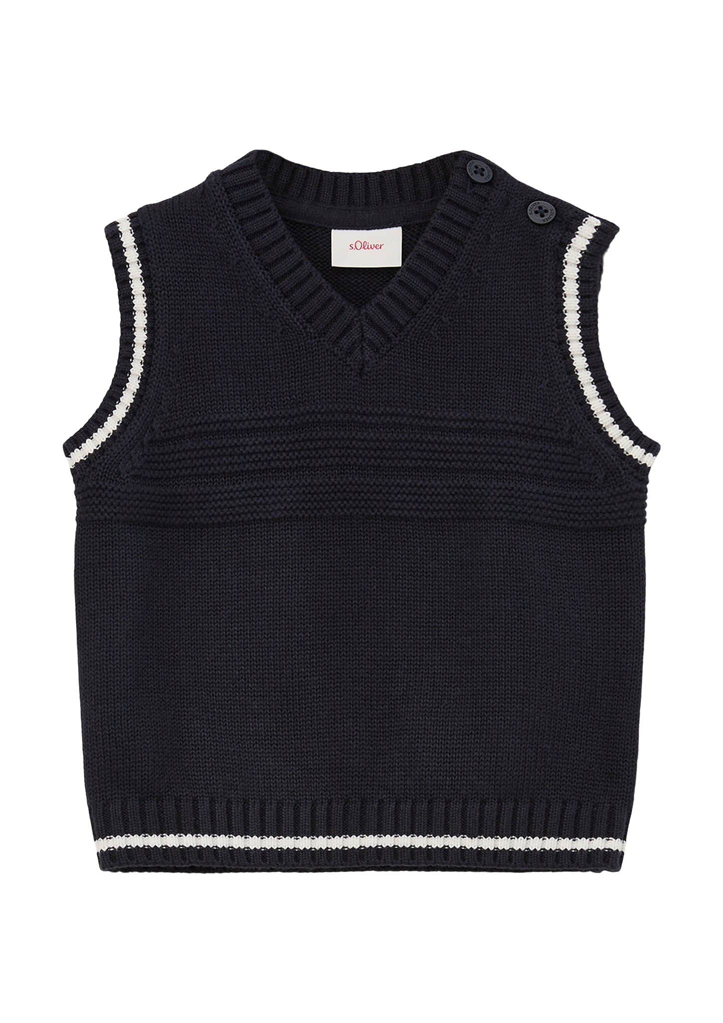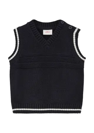 s.Oliver tummansininen neuleliivi vauvoille. Liivissä on v-pääntie ja olalla nappikiinnitys. Hiha-aukoissa ja helmaresorissa kulkee valkoinen kontrastiraita.