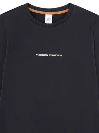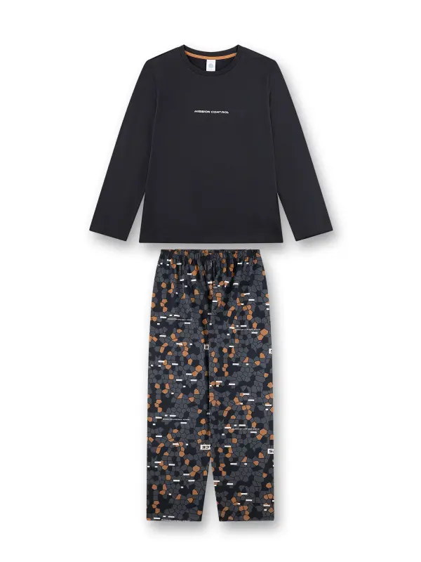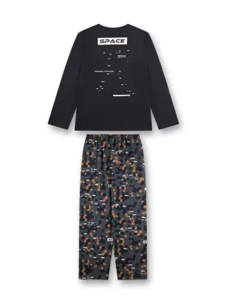 Avaruusteemainen Sanetta pyjamasetti pitkillä hihoilla ja lahkeilla. Settiin kuuluu musta paita tekstiprintillä, ja geometrisesti kuvioidut ruskea-harmaa-mustat pitkälahkeiset housut joustavalla kuminauhavyötäröllä. Valmistettu 100% puuvillasta.
