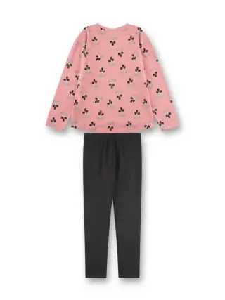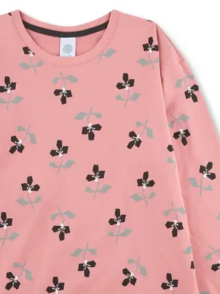 Sanetta pyjamasetti pitkillä hihoilla ja lahkeilla. Setissä on ihastuttava vaaleanpunainen paita, joka on kuvitettu musta-harmailla kukilla ja yksiväriset mustat legginsit joustavalla kuminauhavyötäröllä. Paidan helma on takaa pyöristetty ja aavistuksen pidempi.