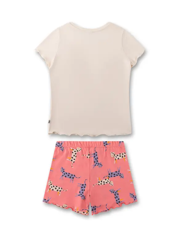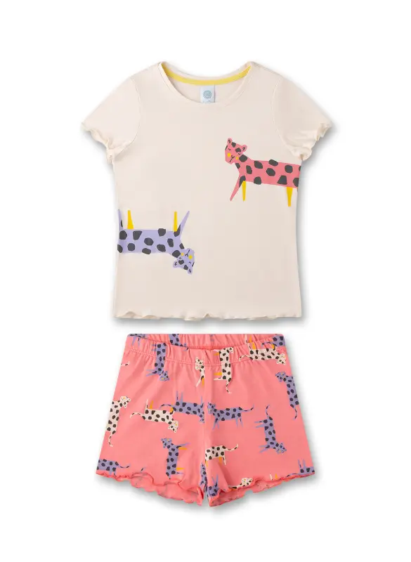 Sanetta tyttöjen lyhyt pyjama vaaleanpunaisena ja luonnonvalkoisena, jossa on siisti leopardi-tuloste ja leikkisät saumat.