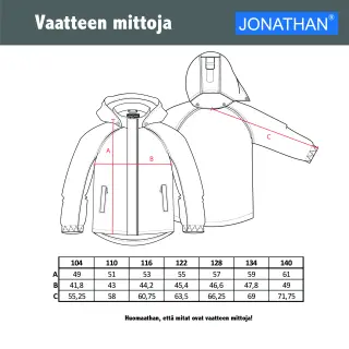 Tähti Jonathan -sarjan tuotteet tunnetaan laadukkaista materiaaleistaan, jotka kestävät hyvin kulutusta sekä pitävät vettä ja tuulta. Yhdistä tarvittaessa valitsemaasi Jonathanin välikerrokseen ja lisää Jonathan talviasusteita tehdäksesi koko asusta säänkestävän!