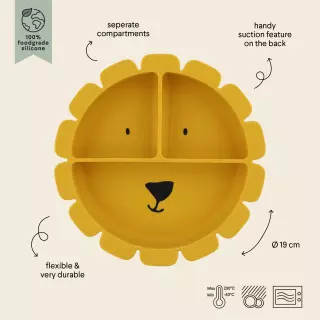 Jaotellut osiot auttavat lasta erottamaan ruokia, makuja ja koostumuksia, mikä tukee itsenäistä syömistä ja ruokailutaitojen kehitystä. Lisäksi lautasen pohjalta kurkistaa Mr. Lion eläinhahmo!