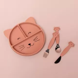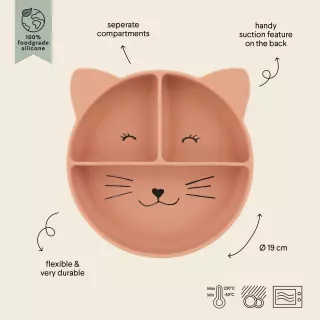 Jaotellut osiot auttavat lasta erottamaan ruokia, makuja ja koostumuksia, mikä tukee itsenäistä syömistä ja ruokailutaitojen kehitystä. Lisäksi lautasen pohjalta kurkistaa Mrs. Cat eläinhahmo!